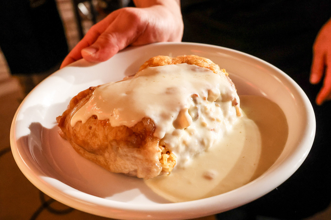 「ニューイヤーズパーティーにぴったりなお料理」というテーマが発表されると、すごいスピードで野菜を切ったり、炒めたり、ソースを混ぜたりする伊地知。時間内に間に合うかな……と心配をしながら作っていたのは、鶏肉の皮と身の間にケチャップライスを詰めた「パリパリチキンライス・チーズソース」。とろりと濃厚なチーズソースが雪化粧のようにチキンを包み込む、ニューイヤーにピッタリなメニューだ。