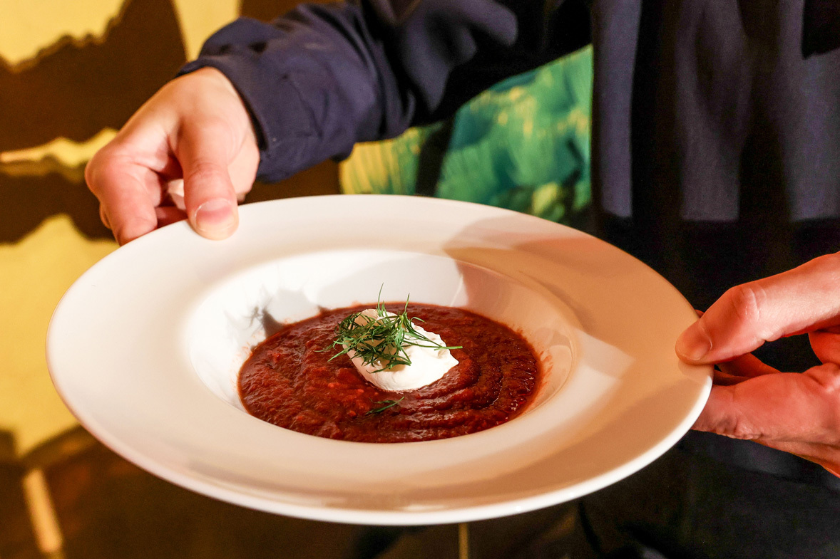 一方、金澤はゆったりとトークしながら調理。「調理器具が優秀だから、時間をかけずにすぐにできちゃう」とTESCOMのブレンダーやグリルなべを紹介しながら、ビーツを使った時短スープを作る。ビーツの赤と飾り付けのサワークリームの白が映える、新年にぴったりな「紅白」のおめでたいメニューに。