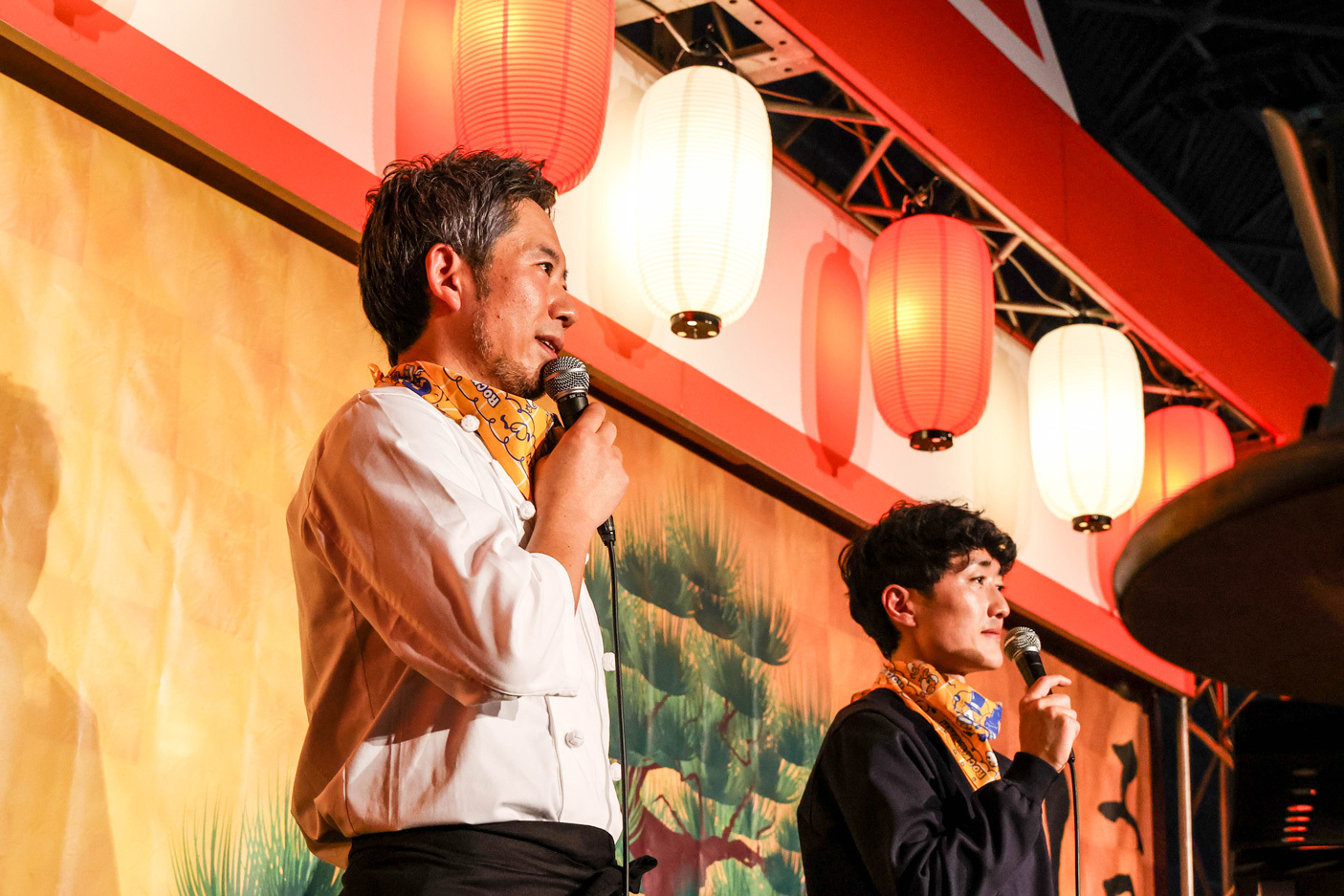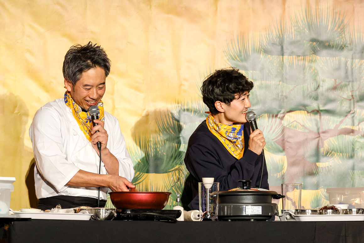 MCのFM802 DJ 加藤真樹子に呼び込まれた、部長・伊地知と副部長・金澤。おそろいのFM802料理部オリジナルスカーフを身につけた正装で登場し、詰めかけたオーディエンスの多さに驚き、「すごくないですか! どういうこと?」「演奏はしませんよ!」と照れ笑い。