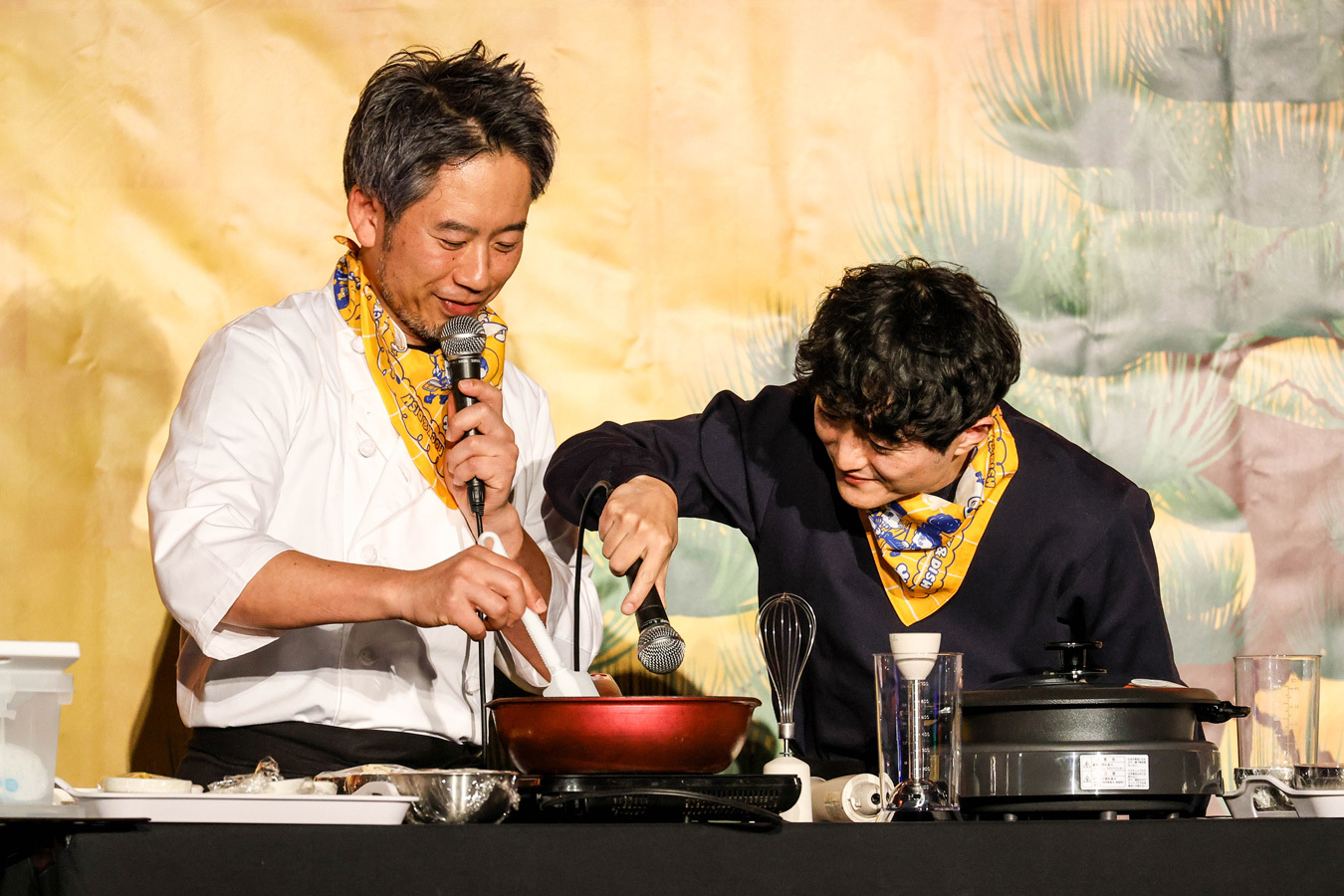 挨拶もほどほどに、さっそく目の前のオーブンに手をかけ余熱で温めはじめる伊地知。30分のステージで料理を完成させなければいけないため、トークと並行して調理の準備にも余念がない。今回の試食ゲストとして迎えられた小倉誠司(flumpool)は、今回で2回目の参加。料理部の2人と古くから親交のある佐藤征史(くるり)は、今回が初参加で「ふたりの料理を食べるのは初めて」と期待を寄せていた。