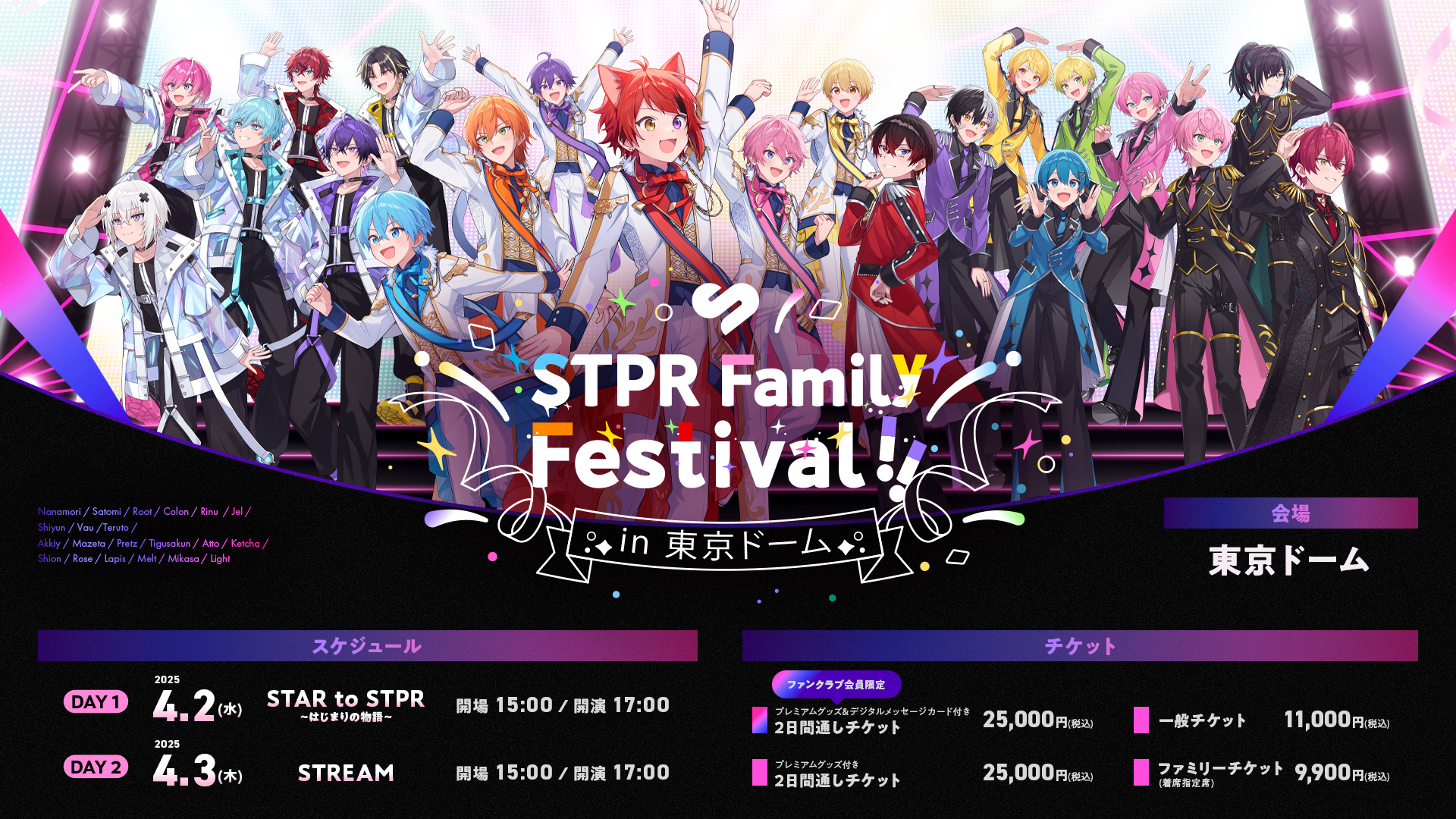 すとぷり、Knight A – 騎士A -、AMPTAKxCOLORS、めておら – Meteorites -など、株式会社STPR所属のクリエイターが集結した大型ライブフェス『STPR Family Festival!! in 東京ドーム』が、2025年4月2日(水)と3日(木)の2日間、東京ドームにて開催されることが決定した。
