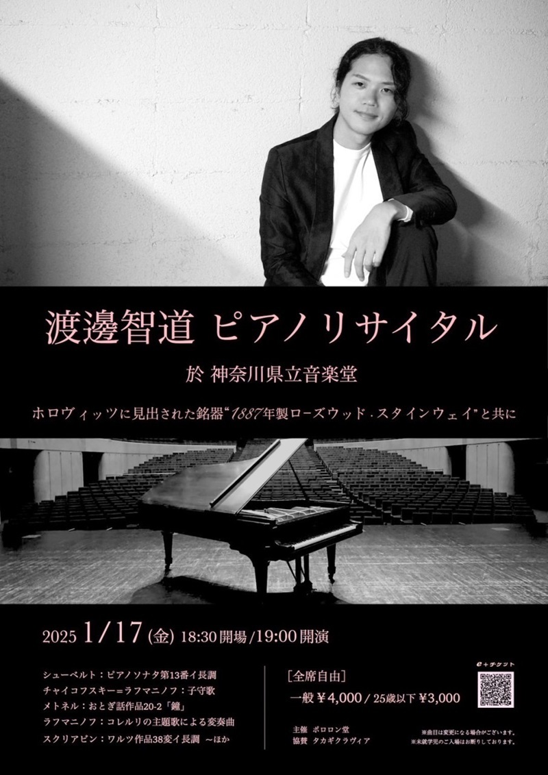 渡邊智道というピアニストを語る上で避けて通れないのがあのホロヴィッツが愛した1887年製のNYスタインウェイのヴィンテージピアノ“ローズウッド”。かつてNYのカーネギーホールの舞台上でセンセーショナルな存在感を誇り、ホロヴィッツをはじめコルトーなど名だたるピアニストたちを虜にした銘器だ。今回、かつてホロヴィッツがその音響のすばらしさに惚れ込んだという逸話が残されていることからも、渡邊自身、長年憧れ続けていたという神奈川県立音楽堂「木のホール」の豊かな音響空間でいぶし銀のような音色を存分に聴かせてくれるに違いない。