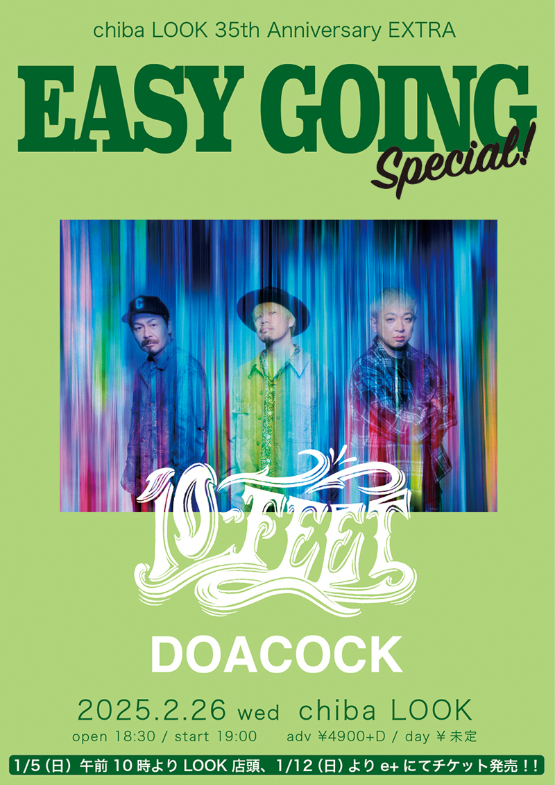 開催日時は2025年2月26日(水)19時開演、会場はもちろん千葉LOOKだ。この、20年以上続くパンクイベント『EASY GOING』に、10-FEETの出演が決定。また千葉LOOKを語る上で欠かせないDOACOCKも共演する。