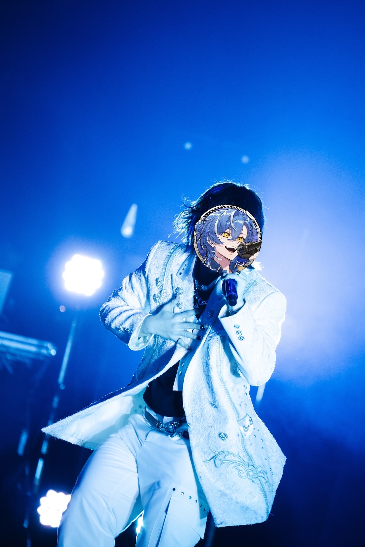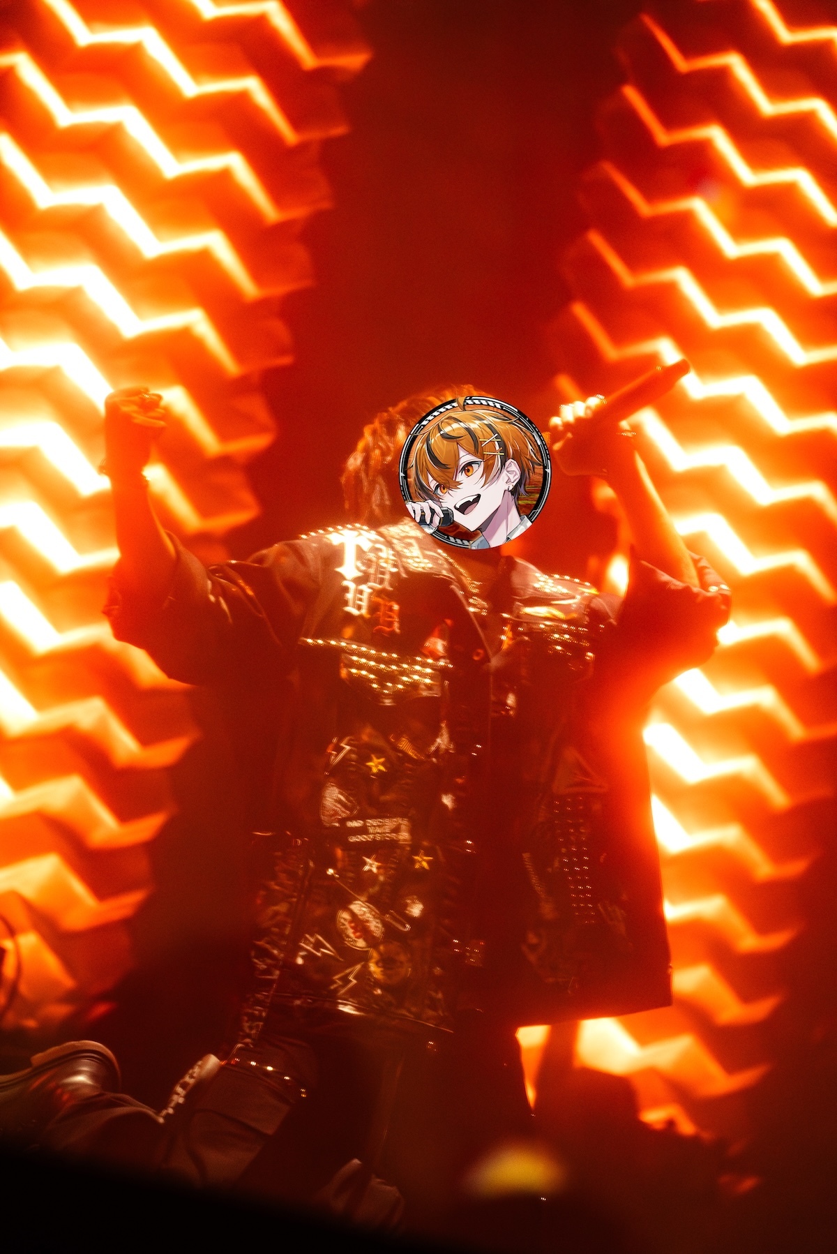 ここで再び“Axel”が登場。ペンライトの動作確認や点灯チェックなどが行われ、来たる黒組のパフォーマンスに向けて空気を整える。黒組の一番手はもちろんリーダーのARKHE。赤いペンライトに迎えられ、「EX RANK」をワイルドに熱唱。自身も好きなHIPHOPチューンで激アツなRAPを披露し、攻めのステージを展開した。続いてはしの。もちろん、ペンライトは紫に染まっていく。そんな彼が歌う「Core」は、彼自身の想いを綴ったような楽曲だ。それだけに、聴く者に刺さるものがある。繊細なしののステージに続き、ガラッと空気を変えたのがうるみや。いきなり「オ~イェ~!」と声を荒げて登場すると、場内は瞬く間にオレンジのライトで埋め尽くされる。曲は「Destination」。疾走感のあるロックナンバーはまさにうるみやならではだ。この高い沸点の流れから黒組曲「Endsville」へ。ステージにはARKHE、しのがうるみやに加わり、ハードなビートで場内をヒートアップさせていった。