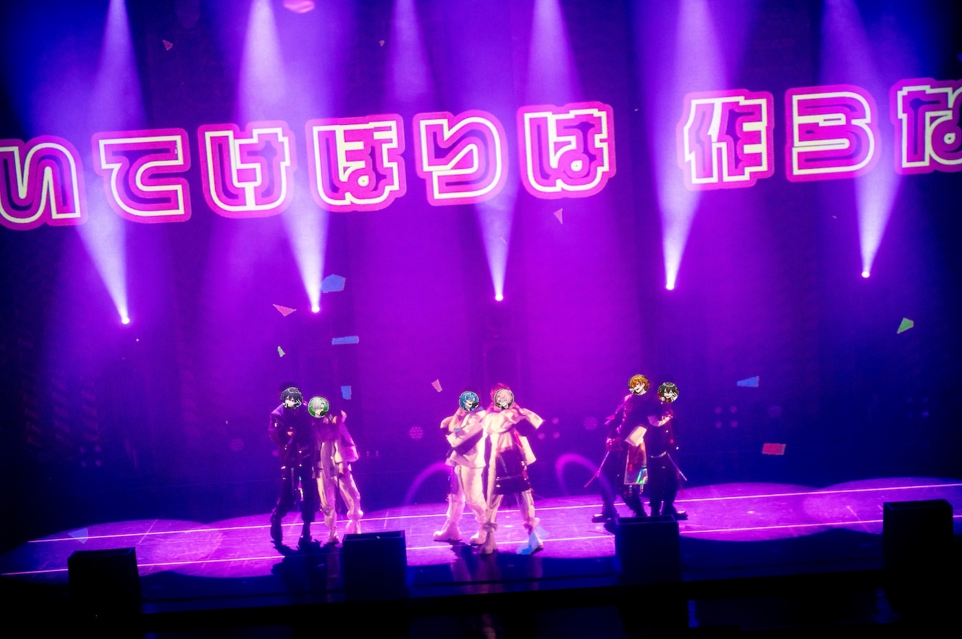 さて、トークタイムのあとは再びライブパフォーマンスへ。白と黒の対決を彷彿とさせる「Order × Chaos」で緊張感のある世界を作り出したり、パーティーチューン「MEGA FUN!!」でハッピーな時間を演出したり。メンバーも自由に動いて会場をのせていく。「MEGA FUN!!」では観客からコールが起こる部分もあったが、すでにメンバーとクロノメイトの息はバッチリの様子。前半ブロックのシメとなる「CARPE DIEM」は、クロノヴァらしいヘヴィーなハードナンバー。テンションが上がるRAPパートもヒリヒリするカッコよさだ。アグレッシブな魅力を見せつけたあと、ライブはインターバルへ。このインターバルでは紗幕にAIキャラクター“Axel”が映し出される。“Axel”は「ライブシステムをアップデートします」と進行。クロノメイトたちのスキャンやペンライトのチェック……など、まるでアトラクションのような仕掛けでワクワク感を煽っていく。この没入感は新しい!