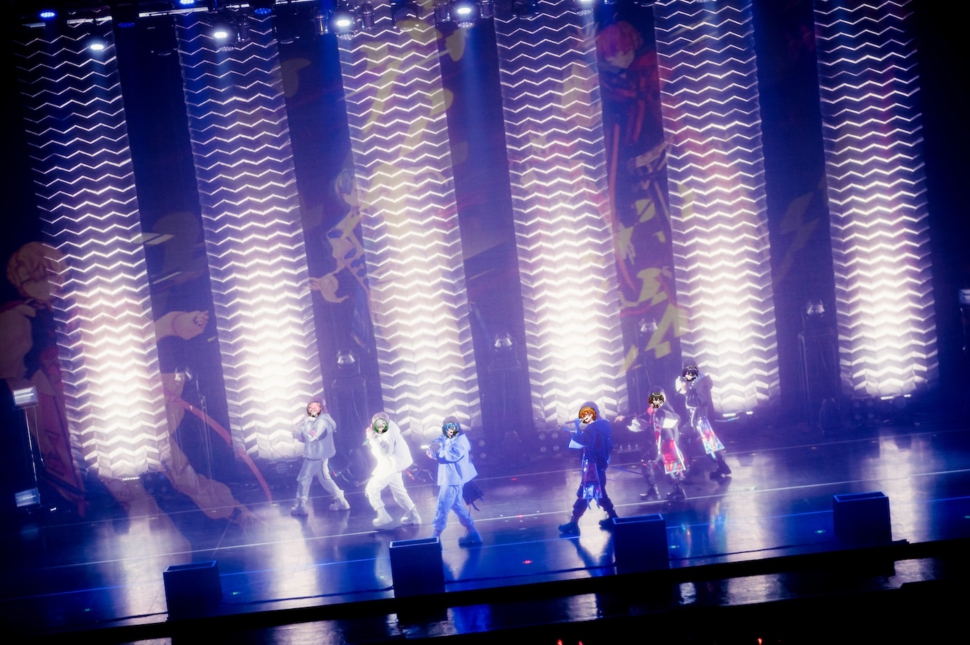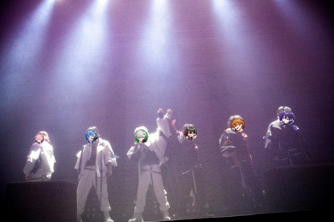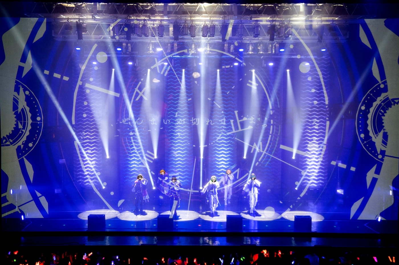 “Axel”のアップデート完了後、ここからはメンバーのソロコーナーに突入。それぞれの色を活かしたステージに期待が高まる。まずは白組リーダーのかなめから。場内のペンライトは一気にグリーンが点灯する。かなめはステージ中央に設置された椅子に座り、バラード曲「fake idea」を歌唱。甘い声でうっとりするように歌い上げ、クロノメイトを悩殺した。ソロ2番目は甘夢れむ。彼のイメージカラーであるピンクのペンライトが、彼が歌う「宵闇のMagic」を彩る。激甘の歌声がピッタリのポップチューンをかわいいダンスでしっかりアピール。フロアからは「かわいいよ~!」との声が飛んでいた。続いてはしゃるろ。「みんな楽しむ準備はできてる?」と優しく問いかけ、ペンライトをブルーに変えた。歌ったのは、広がりのある爽やかなロックナンバー「shine」。曲中にはアクロバティックなアクションも見せ、クロノメイトをシビレさせる。3人のソロが終わると、白組3名による「On Fire」へ。躍動感のあるダンスチューンで爽やかに白組ブロックを締めくくった。