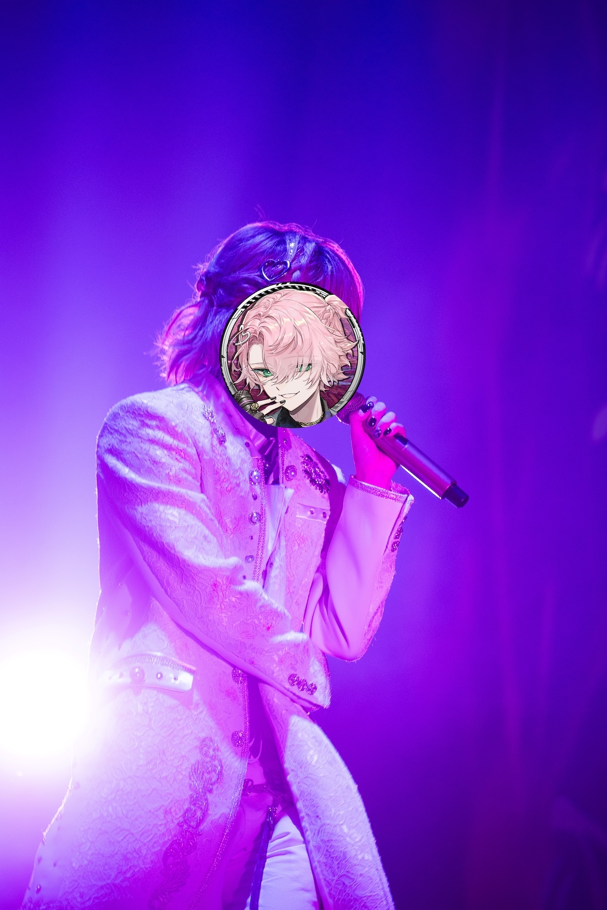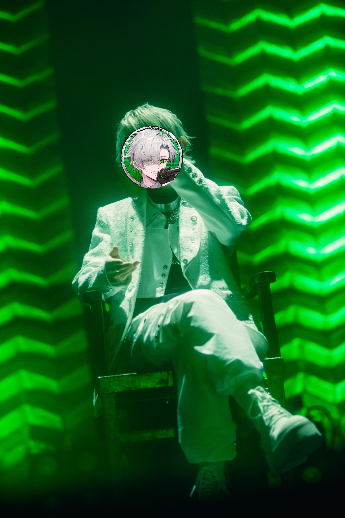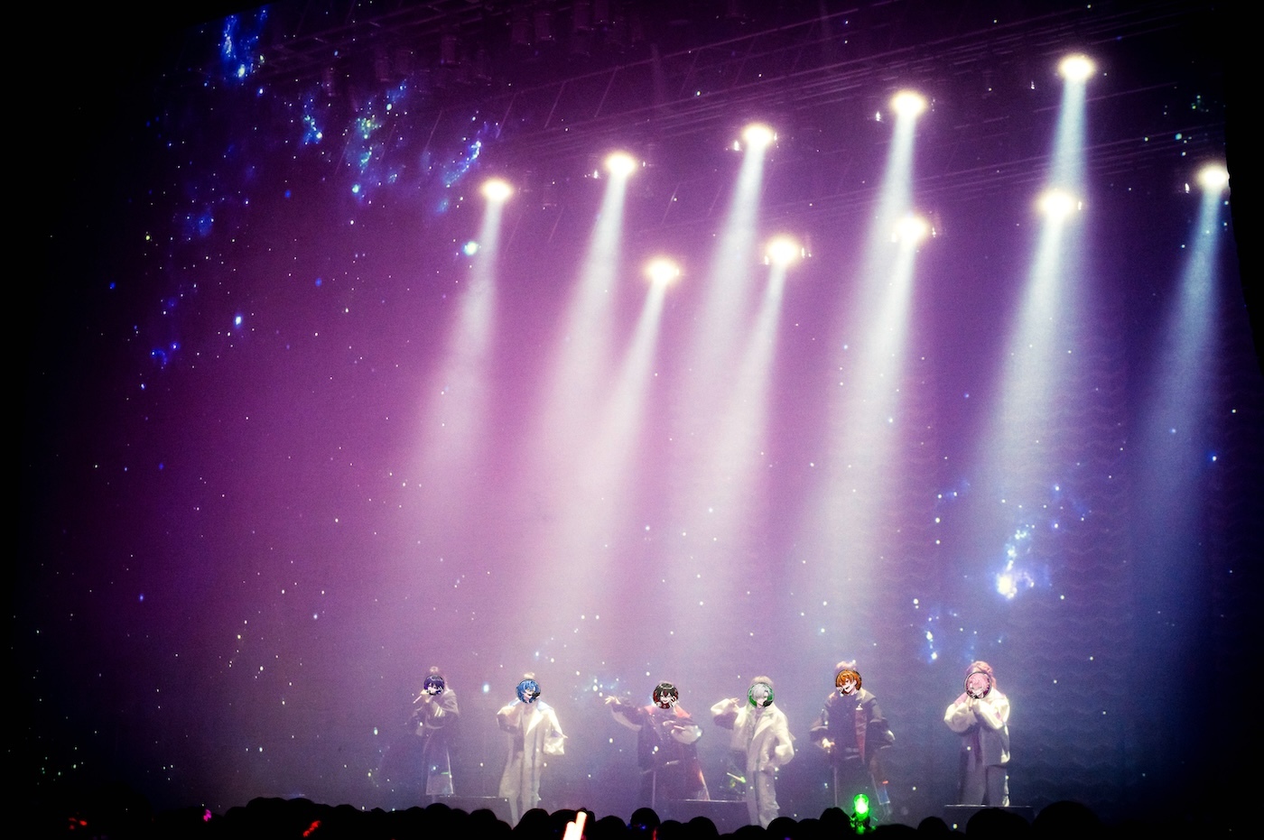 “Axel”のアップデート完了後、ここからはメンバーのソロコーナーに突入。それぞれの色を活かしたステージに期待が高まる。まずは白組リーダーのかなめから。場内のペンライトは一気にグリーンが点灯する。かなめはステージ中央に設置された椅子に座り、バラード曲「fake idea」を歌唱。甘い声でうっとりするように歌い上げ、クロノメイトを悩殺した。ソロ2番目は甘夢れむ。彼のイメージカラーであるピンクのペンライトが、彼が歌う「宵闇のMagic」を彩る。激甘の歌声がピッタリのポップチューンをかわいいダンスでしっかりアピール。フロアからは「かわいいよ~!」との声が飛んでいた。続いてはしゃるろ。「みんな楽しむ準備はできてる?」と優しく問いかけ、ペンライトをブルーに変えた。歌ったのは、広がりのある爽やかなロックナンバー「shine」。曲中にはアクロバティックなアクションも見せ、クロノメイトをシビレさせる。3人のソロが終わると、白組3名による「On Fire」へ。躍動感のあるダンスチューンで爽やかに白組ブロックを締めくくった。