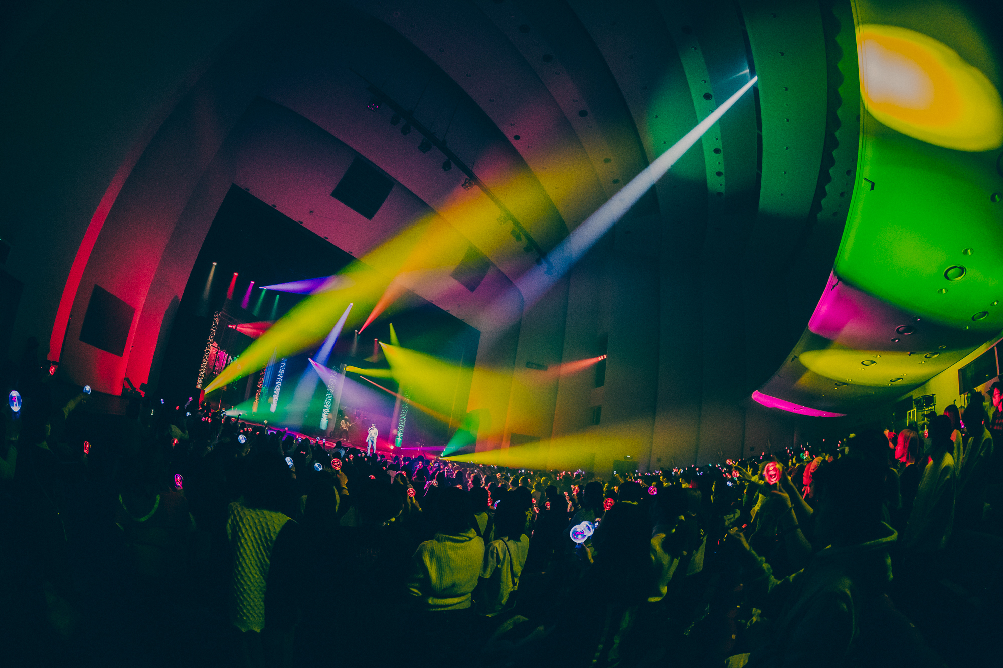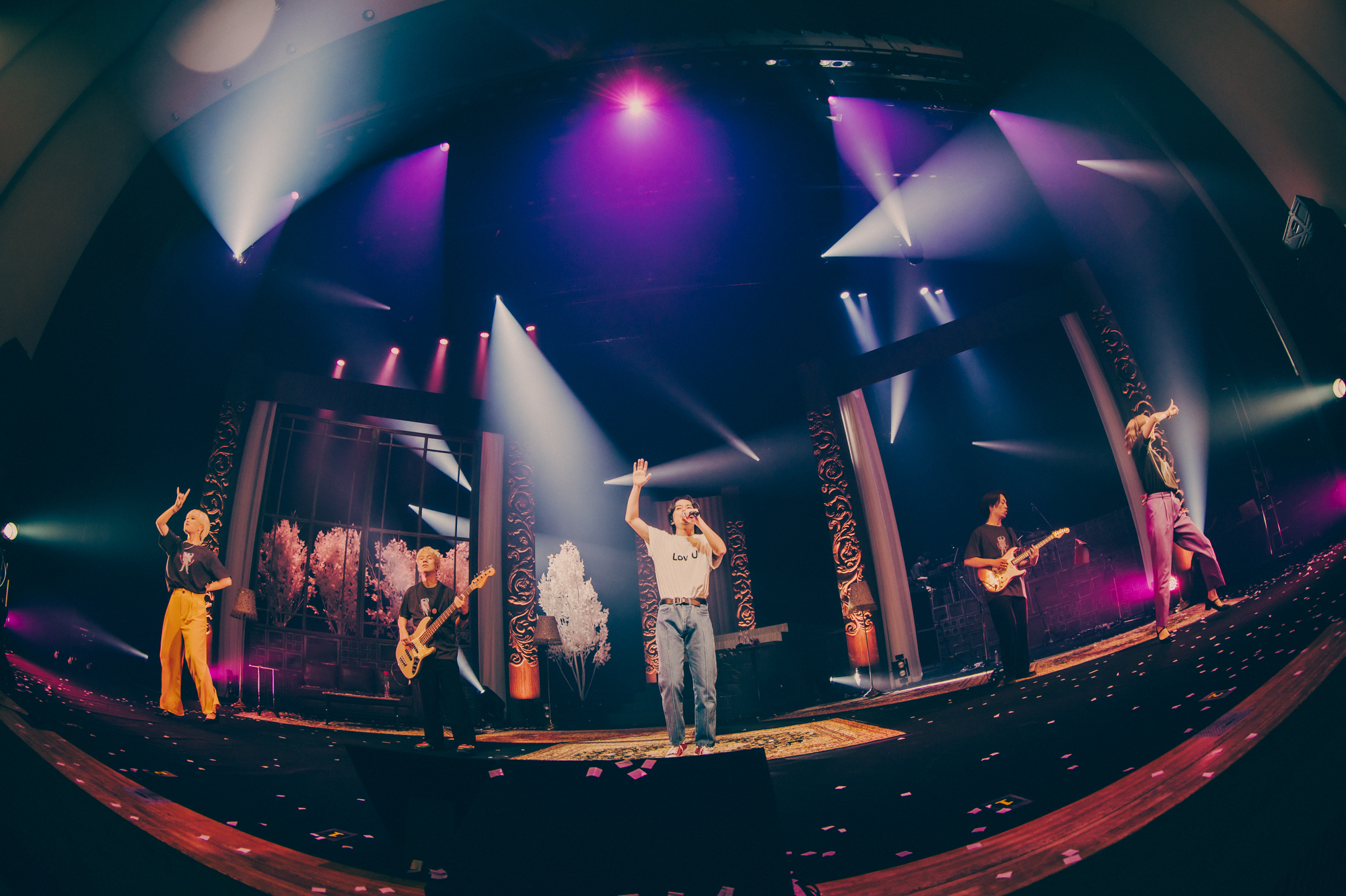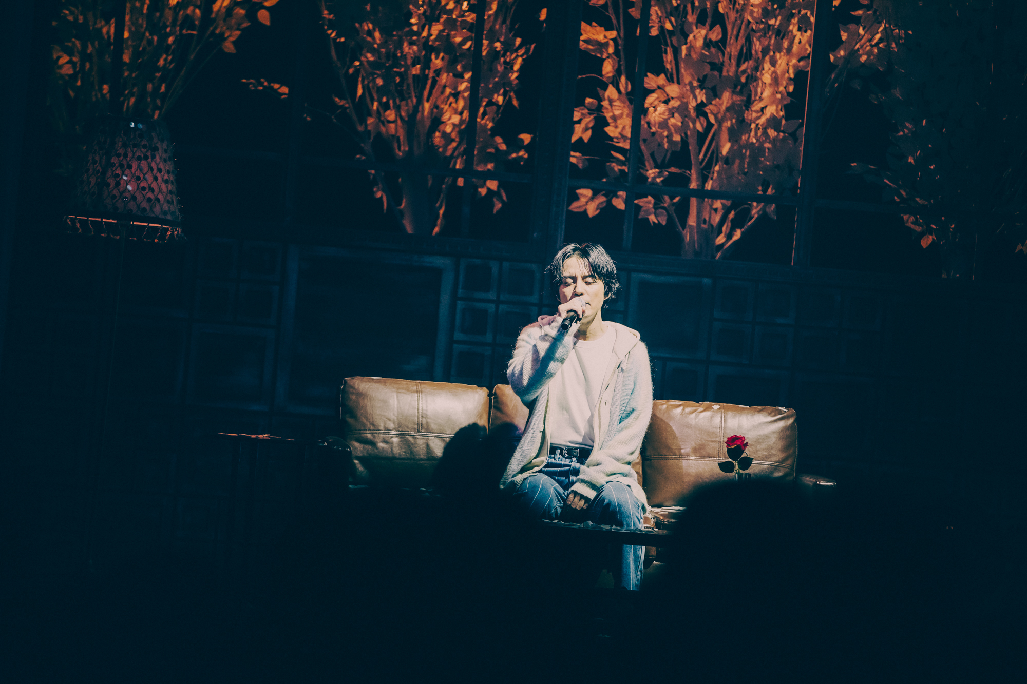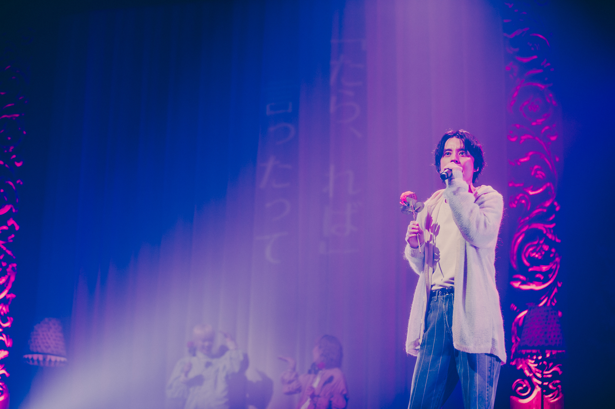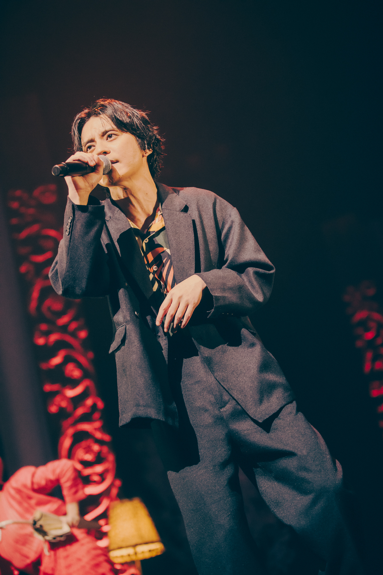 「人との出会い、目には見えない繋がりによって宝物のようなアルバムができたと思っています。どの曲も最高やろ? 自分ひとりでは絶対に辿り着けないところに行けたし、いろいろな刺激、景色を見させていただいた制作期間でした」――最新アルバム『Lov U』の制作を振り返ったMCの直後、突然どこからか聞こえてきた“天の声の天さん”の声。「2024年の活動」「今回のツアーの開催地の1つである上海の思い出」「ファンコミュニケーションアプリ『bubble』への想い」が天さんとのやり取りを通じて語られたひと時を挟み、さらに届けられた2曲はファンを大いに沸かせていた。「20年くらい前に歌ってた曲だと思います。」と言いつつ歌い始めたのは「琉我」。ジャズ歌謡テイストのサウンドを乗りこなしながら歌い、妖艶な色香を漂わせていた。そして、その直後に届けられた「LOVE」は超レア曲。2019年にリリースされた1stアルバム『二歳』のオフィシャルファンクラブ「Shubabu」会員限定購入特典『全部一人でやってみたCD』に収録されていたこの曲がライブで披露されたことは今までに一度もない。作詞作曲編曲、レコーディング、ミックス、マスタリング、納品、ジャケットデザインまでを自身で行った完全手作り作品の曲をステージで歌うならば、今日しかないと思ったのだという。鈴の音を含む温かなサウンドアレンジは、観客への素敵なクリスマスプレゼントだった。