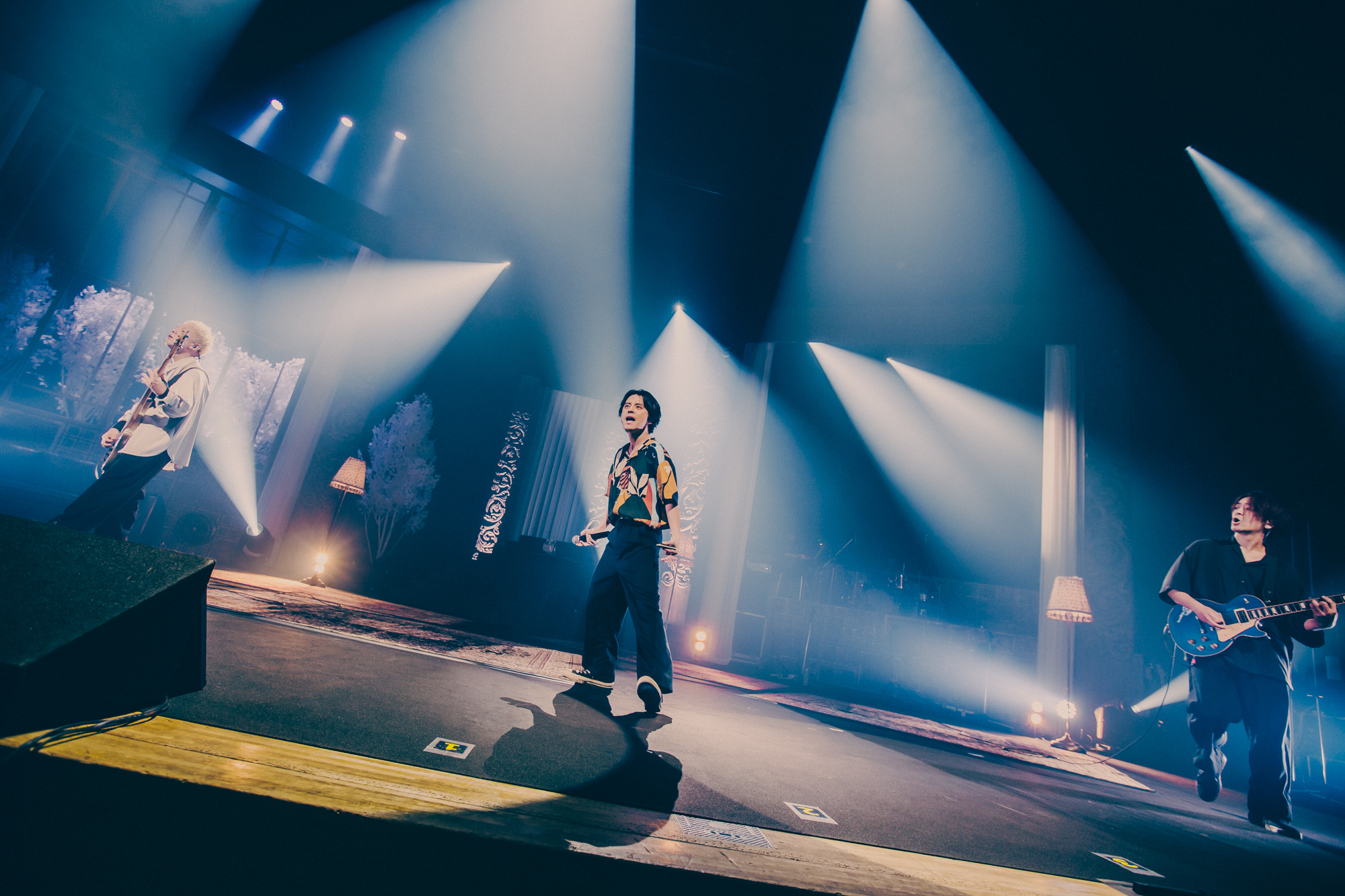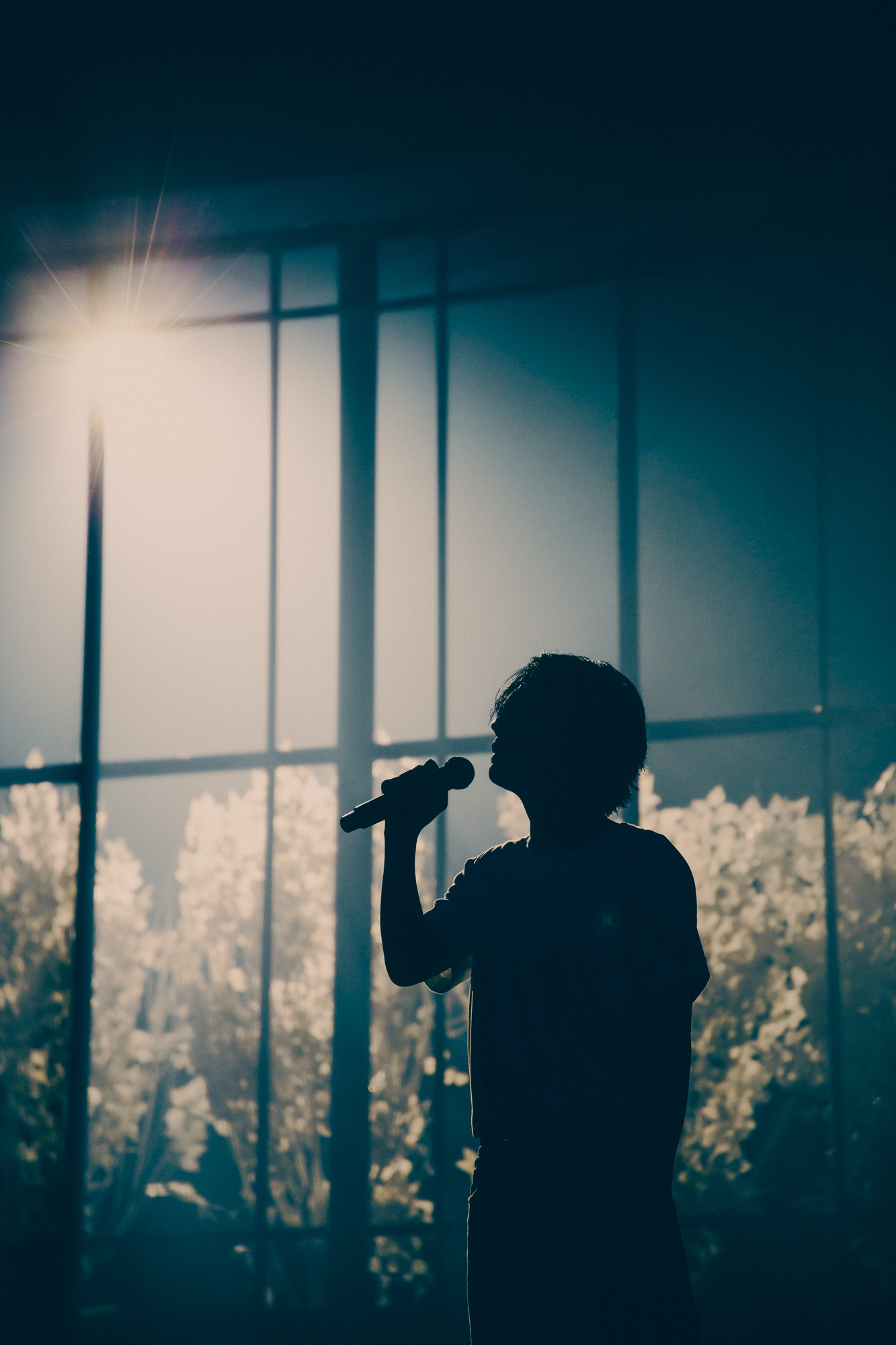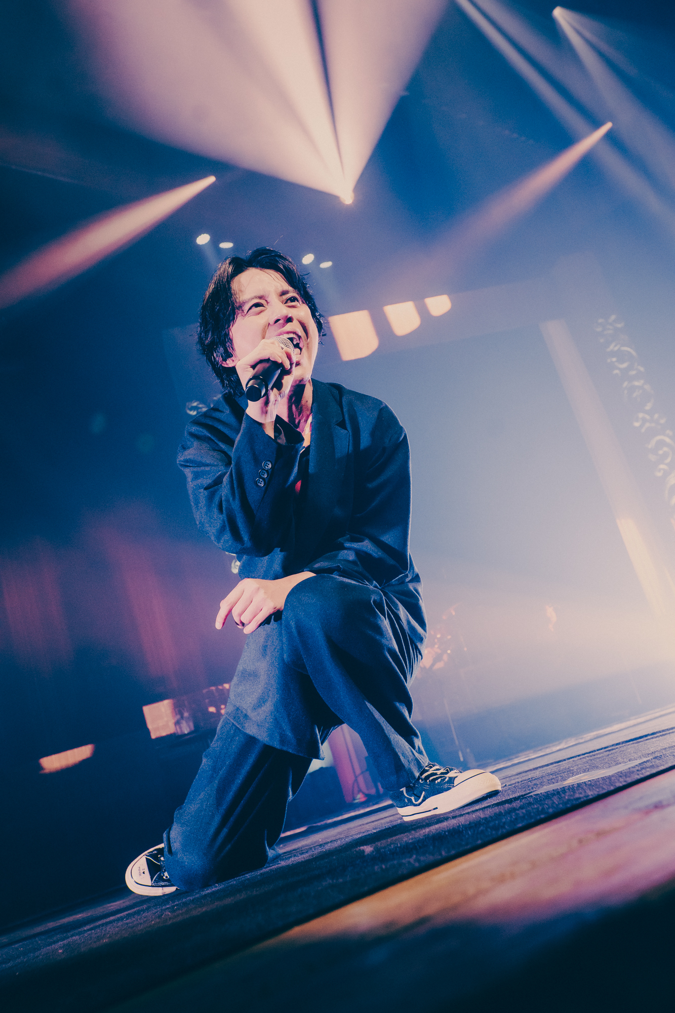 ステージを覆っている紗幕に投影されたオープニングムービーを経てスタートしたバンド演奏。ギターをつま弾き、ペンを走らせる様子を捉えた映像が紗幕の表面で揺らめき、その向こう側にいる渋谷すばるの姿がライトを浴びて浮かび上がった。最初に歌ったのは「First Song」。様々なクリエイターが楽曲提供をした最新アルバム『Lov U』の中で唯一、彼が作詞作曲を手掛けたこの曲は、様々な体験と葛藤を経て迎えた第三章への想いを伝えてくれる。音楽を愛してやまない彼がステージで活き活きと歌っているのが、とても嬉しく感じられるオープニングだった。