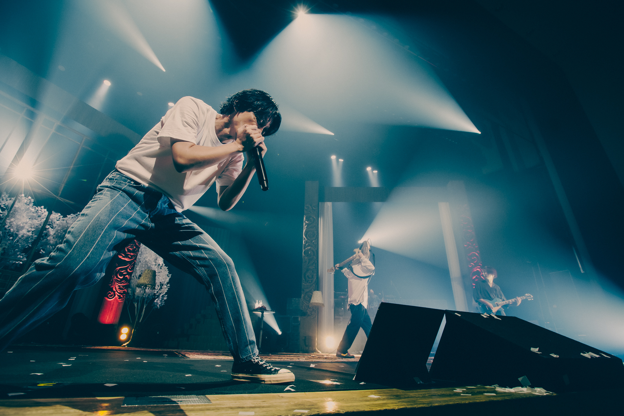 紗幕が上がり、眩しいライトで照らされたステージ。そして観客が一斉に点灯したペンライト。鮮やかな光で包まれた客席に向かって「君らしくね」と「Lov U」も届けられた後、最初の小休止を迎えた。「10月にニューアルバム『Lov U』がリリースされまして、今日は『Lov U』の曲はもちろんですが、いろんな曲をお届けします。今日はすごいですよ。最高のクリスマスイブにしましょうね」と渋谷が呼びかけると、明るい歓声が応えた。ハンドマイクで歌いながらステージ上を巡り、時折観客に向かって手を振っていた「ライム」。2人のダンサーのパフォーマンスが加わり、舞台作品の一場面のような空間を作り上げていた「アオ」と「ロマンス横丁」……穏やかな3曲を経て、バンド演奏と歌声は一気に熱量を高めた。ブルースハープを吹き鳴らし、骨太なビートを乗りこなしながら歌った「トラブルトラベラ」。観客の激しい手拍子を誘った「ベルトコンベアー」。吼えるかのように歌う姿が鮮烈な印象を残してくれた「爆音」……メドレーとして構成された3曲の連発を導火線とするかのように雪崩れ込んだ「ないしょダンス」は、爆発的な盛り上がりとなった。ステージの最前線に躍り出たバンドメンバーの大宮啓之(Gt)、安達貴史(Ba)と並びながらブルースハープを奏で、挑発的なトーンで放った歌声。演奏が幕切れた時、渋谷は寝そべって息を整えていた。