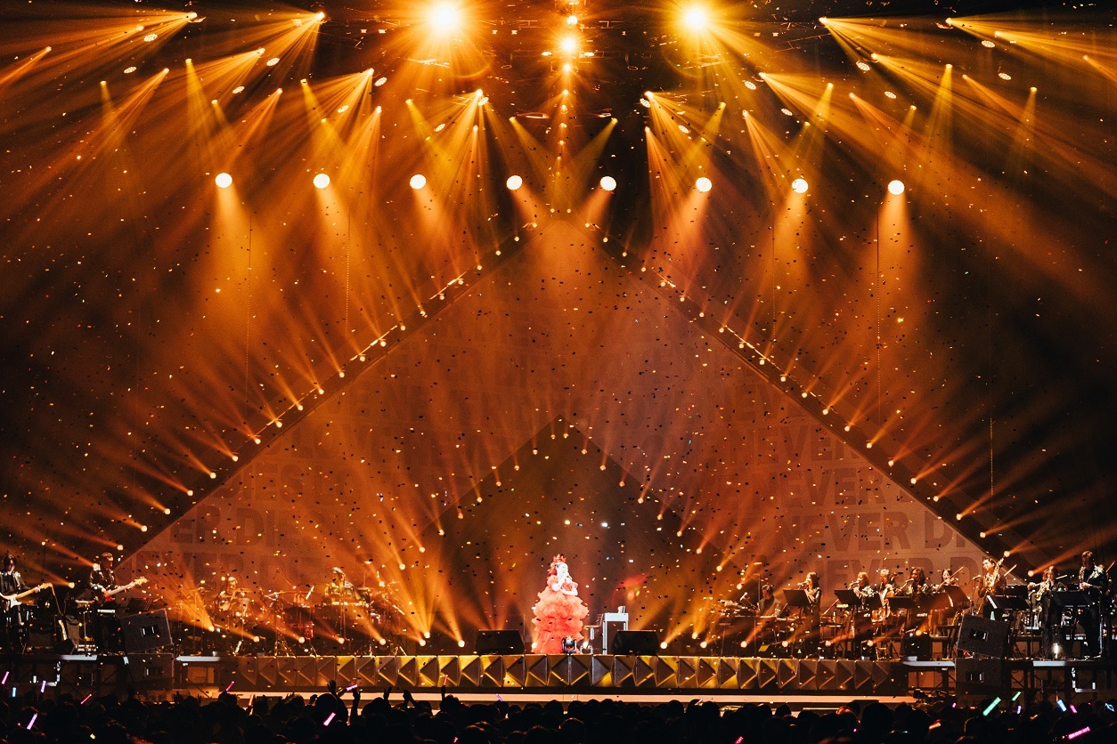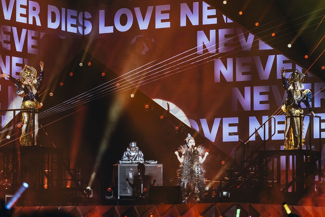 その巨大オブジェがオーケストラ・サウンドとレーザーによるライティングに染められると、“LOVE NEVER DIES”の文字に彩られたLEDがオブジェを中心にまるでピラミッドのように煌めく。そして、バレエダンサーたちが華麗に舞うなか、MISIAが登場。オープニングは、昨夏開催されたパリ五輪に向けたアスリート応援ソング「フルール・ドゥ・ラ・パシオン」だ。