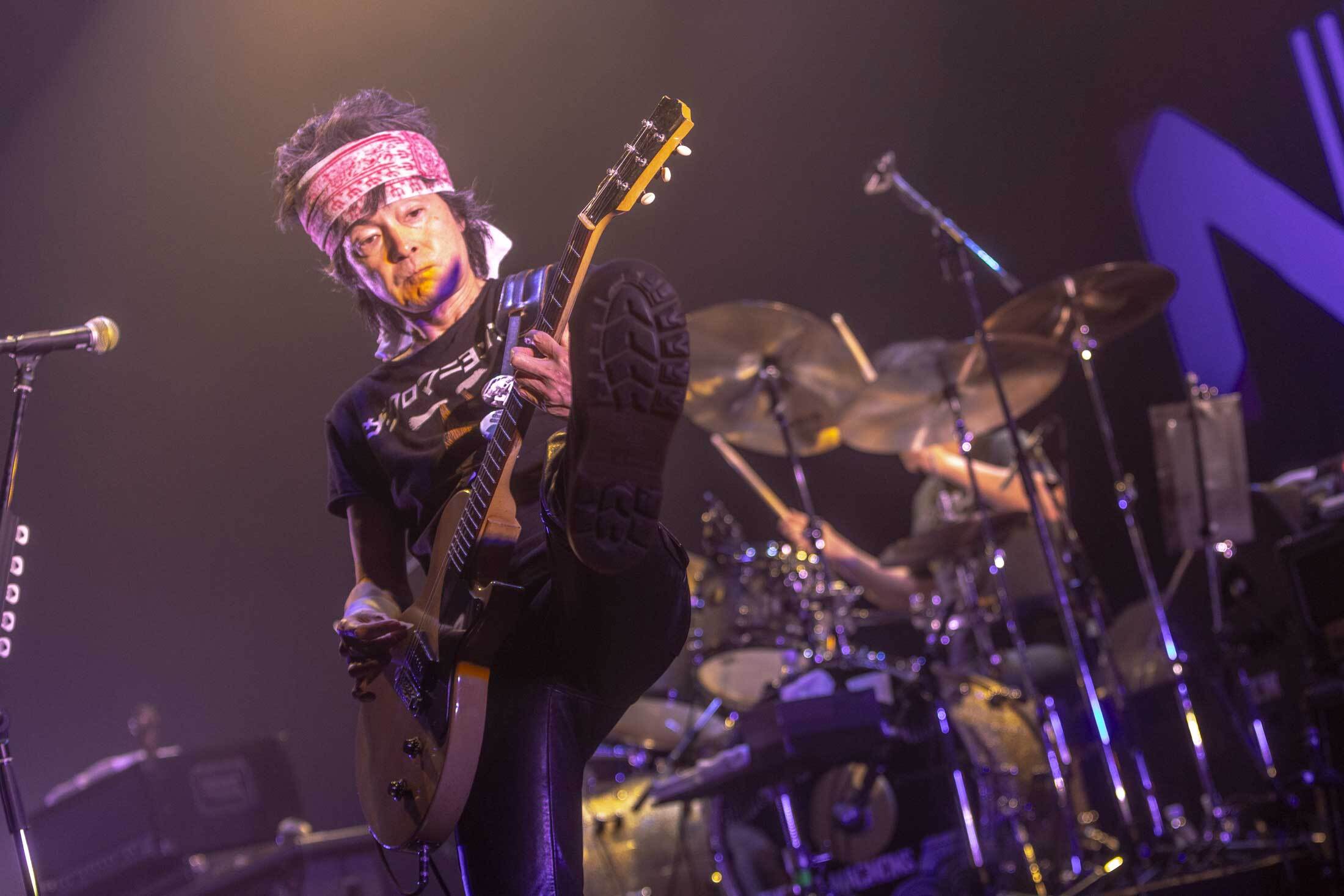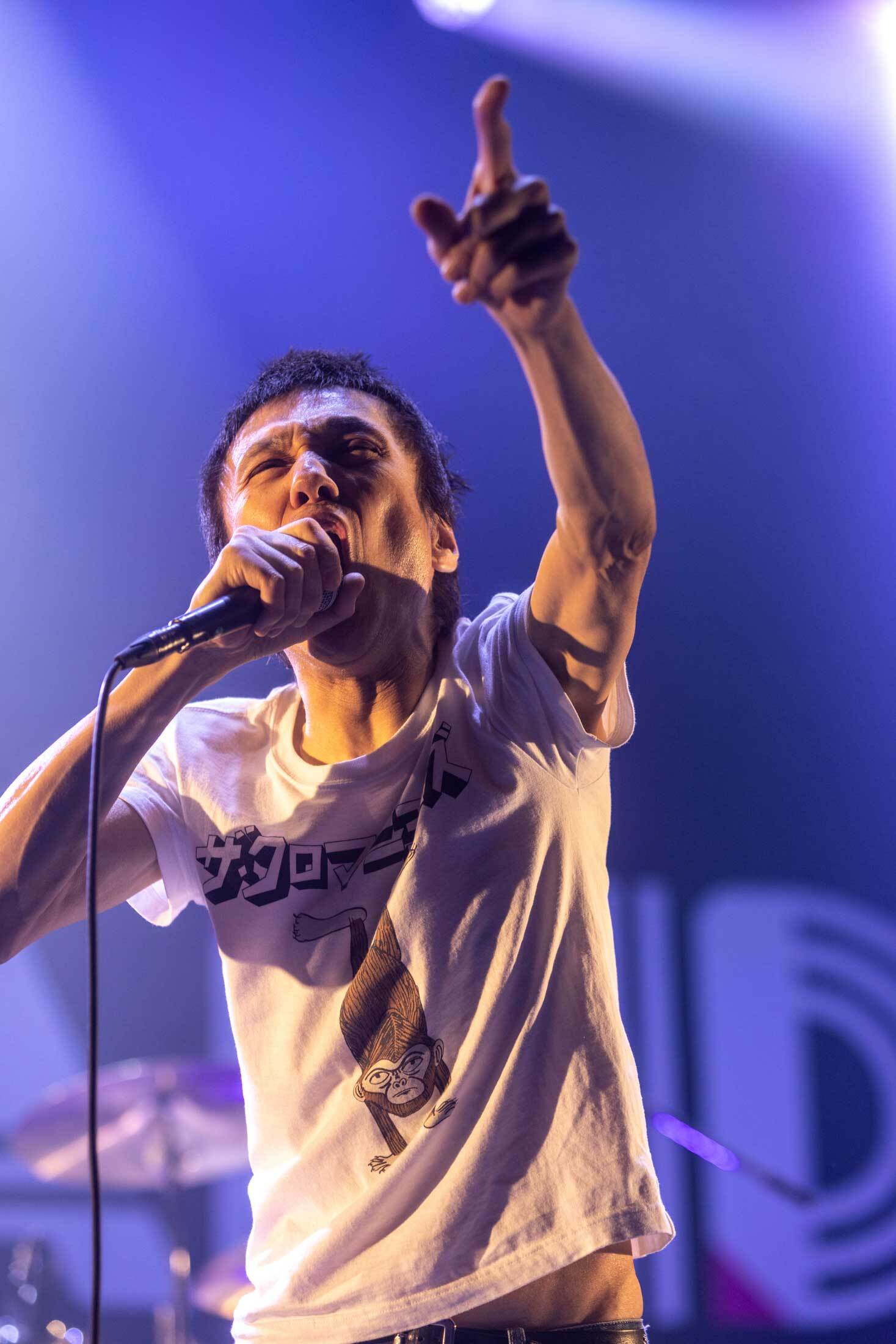 そして、「まだまだ心たぎらせますか? ロックンロール好きでしょ!? ぶつけあおうぜ!」と最新アルバムからソリッドなロックチューン「来来来」とサビのキャッチーさが癖になる中毒性の高い「平安」、「アイ ラブ ロックンロール!」とコール&レスポンスでロックンロールへの愛をぶつけ合った「カウンターアクション」と駆け抜け、最後はライブアンセム「平成ペイン」でフィニッシュ! 「愛しているぜ、ロックンロール!」と叫び、革ジャンの下のザ・クロマニヨンズTシャツを観客にお披露目したジェットセイヤが側転しながらステージをあとにするなど、バニラズからはやり切った充実、観客からは高揚を感じられる多幸感あふれるライブになった。