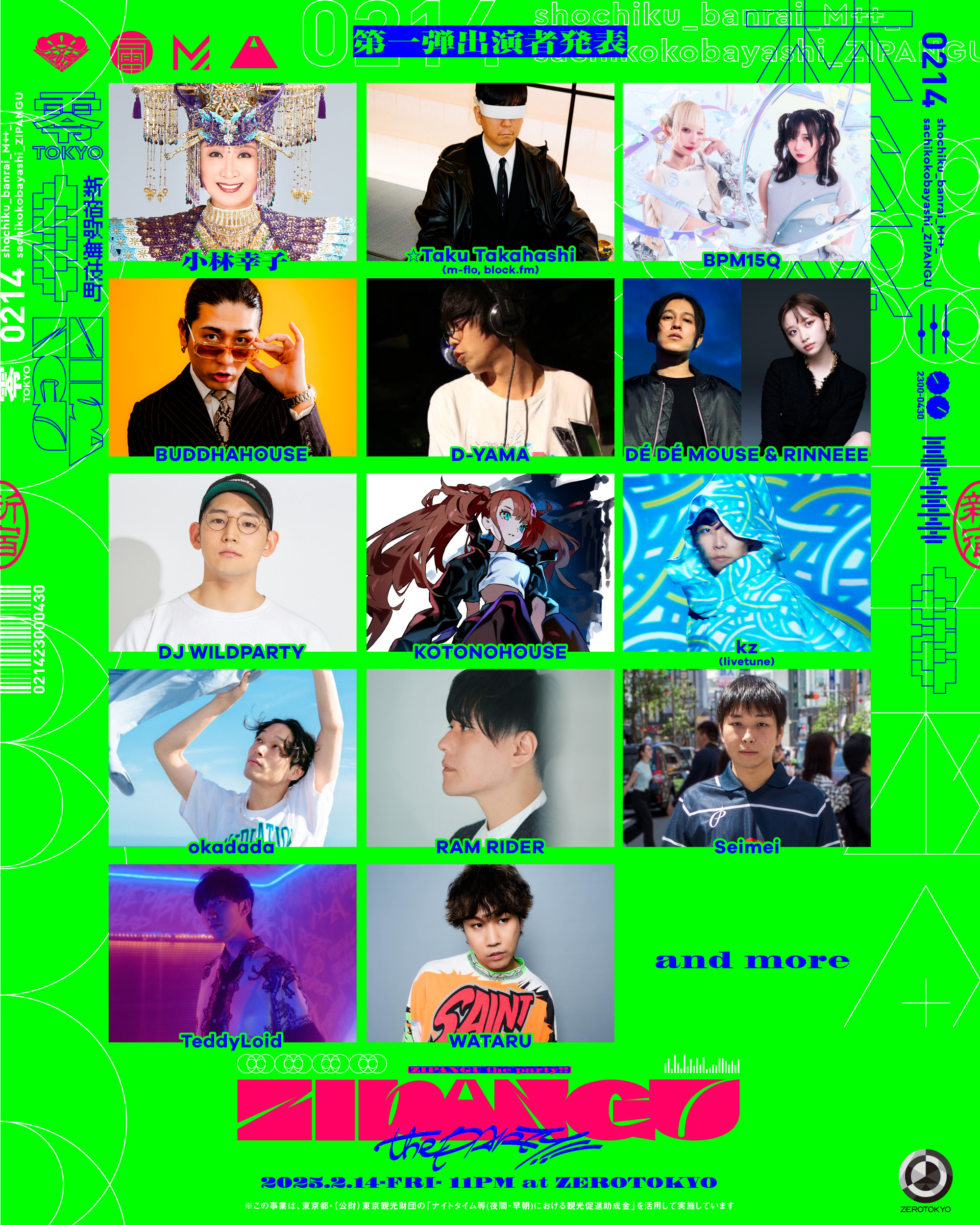 また、「ラスボス」の愛称で親しまれる小林幸子がクラブシーンに初降臨する「ZIPANGU 特別ステージ」も予定。同ステージでは島根県の伝統芸能「石見神楽」の華やかな衣裳と力強い舞が、世界的音楽イベントのパフォーマンスを手掛けるクリエイティブ集団「MPLUSPLUS」の光・音・映像の演出と融合。2023年12月に実施された『ZIPANGU 光が彩る演舞祭』のパワーアップ版となり、光り輝くLEDダンサーと神楽舞のダンスバトル、和太鼓とEDMの対照的な組み合わせによる史上初のセッションが見どころ。そこに全長17メートルの巨大LED大蛇を引き連れた「“ラスボス”小林幸子」が降臨。きらびやかな光に包まれた一夜限りのスペシャルパーティーとなる。なお、イベント当日には「ZIPANGU 特別ステージ」のテーマソングとなる小林幸子の新曲が初お披露目される予定。