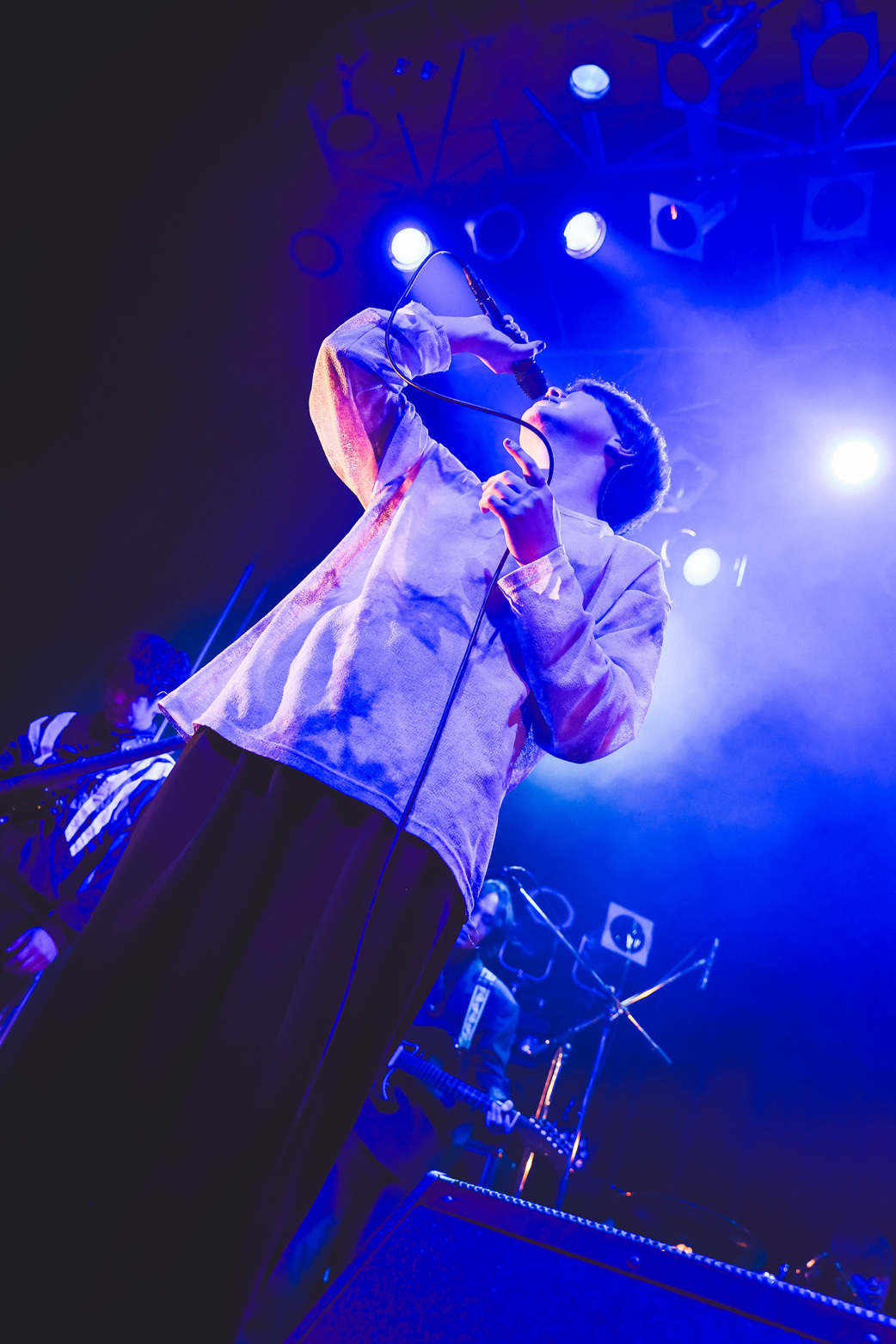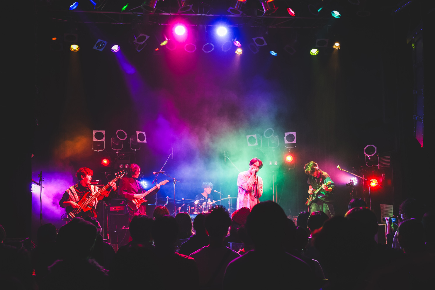 少しダークで攻撃的なサウンドを爆音で響かせつつ、Rikiはゆらゆらと気怠そうに、しかし伸びのある歌声で会場を満たしていく。「傷口」ではさらに勢いを強め、フロントマン4人が一斉に前に出て、フロアを煽るように自由に動いて楽器をかき鳴らす。続けざまにゴリゴリのロックチューンを投下。演奏力の高さを感じるプレイに舌を巻いたが、メンバー1人1人の際立った存在感も印象的で、現役大学生とは思えない圧巻の佇まいだ。Rikiもがなるようなボーカルや力強いロングトーンでオーディエンスを圧倒していく。