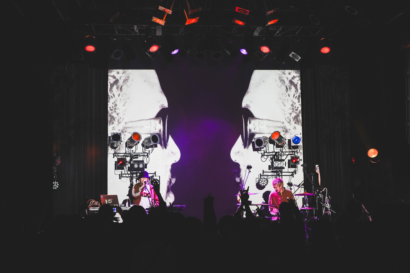 1日目のトリはクリエイティブミクスチャーユニット・NIKO NIKO TAN TAN。お馴染みのバンドロゴがあしらわれたネオンがステージで光る。真っ赤な幕が開き、サイレンが鳴り響くとステージにDrug Store Cowboy(VJ・アートワーク)ハイセンスな映像が映し出される。VJもSEも最高にカッコ良い。やがてOCHAN(Vo.Syn.etc)とAnabebe(Dr)が登場し、10月にリリースされた最新曲「怪人」からライブスタート。OCHANの歌声にAnabebeのビートが重なり、映像や同期、照明も駆使した表現で、早速ニコタンの世界観を築き上げていく。間髪入れずに投下された2曲目(新曲)では、夜の高速道路を流れるような光の映像に合わせてミラーボールの光が会場を駆け巡り、境界線が曖昧になったことで、映像世界が3次元に飛び出したような感覚を味わうことができた。疾走感のあるエレクトロサウンドがとにかく気持ち良く、オーディエンスは夢中でステージに食らいついた。