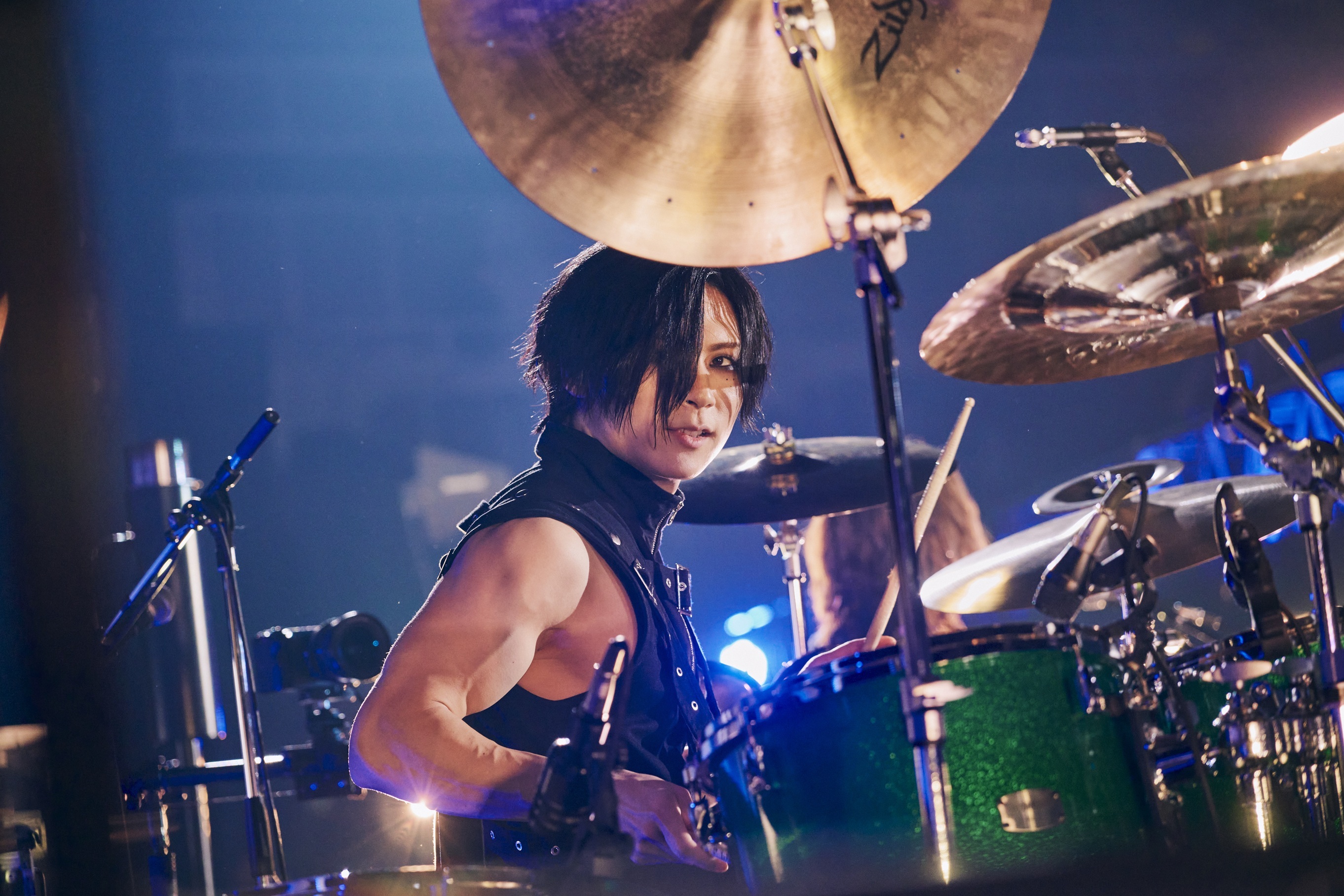 そんなギミックのない始まりだったからこそ気付けたことではあるのだけど、このバンドには、サポートギタリストの菅野尋も含めてバカテクのミュージシャンが揃っているのにもかかわらず、技術力を前に押し出すタイミングが非常に少ない。「復讐は正義」や「兎girl」などで登場する命のギターソロは独特なフレージングも含めてスリリングでカッコいいし、音量もグッと上がるのだけど、それ以外の場面で前に出てくることはない。影丸の手数多めなドラミングも最高だ。中盤の見せ場、気合の入ったドラムソロコーナーはかなり痺れた。テクニカルな上に音は重いし、プレイの合間にお遊びまで入れて参拝者を笑わせる。しかし、それ以外ではあくまでも縁の下の力持ちに徹していた。それはベースの龍矢も同様だ。まあ、それでも終演後には会場の外で「ドラム、すげー!」と大興奮している男子がいたほどで、縁の下に収まりきらない存在感が彼らのプレイにはあるのだが。