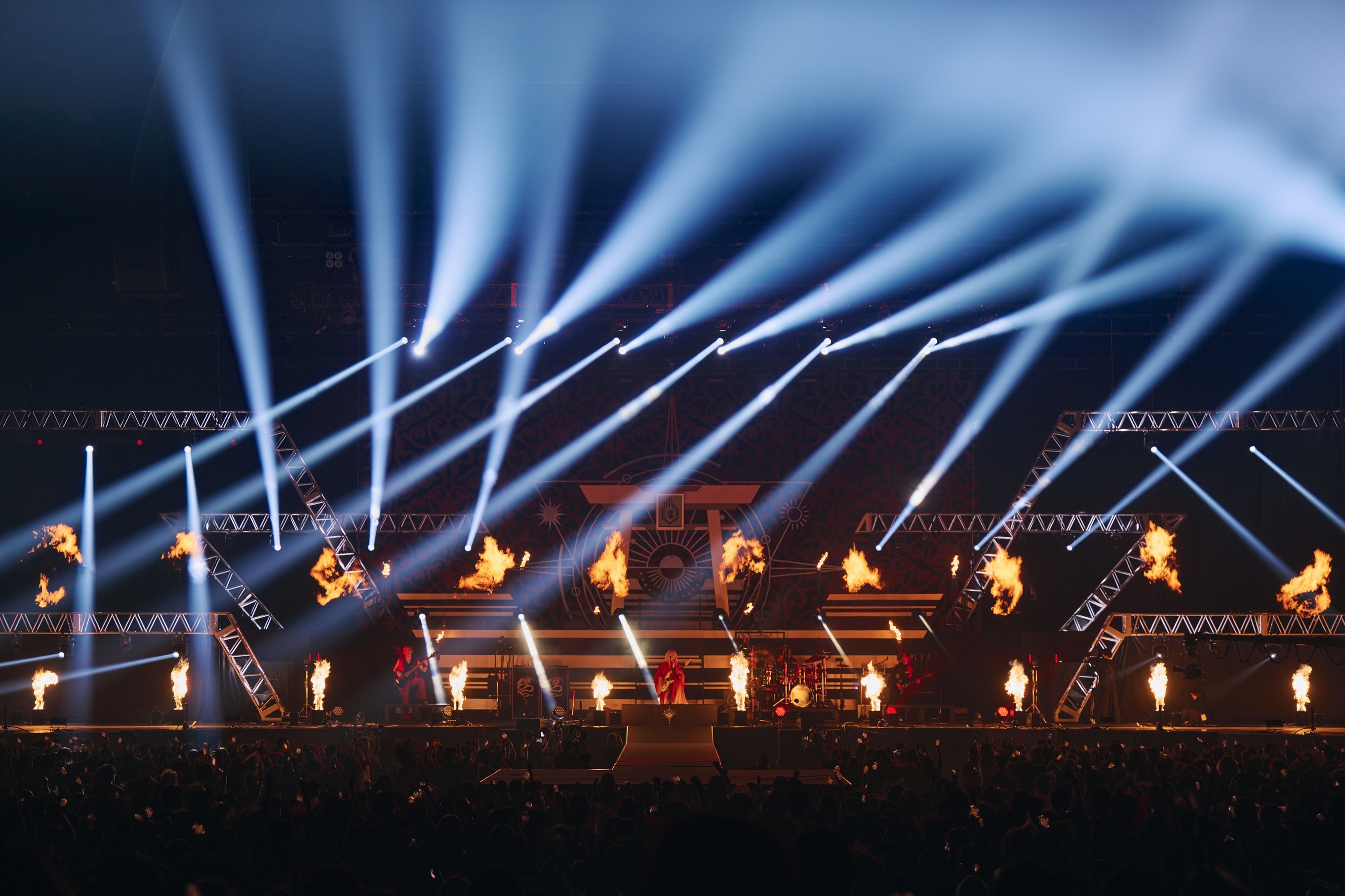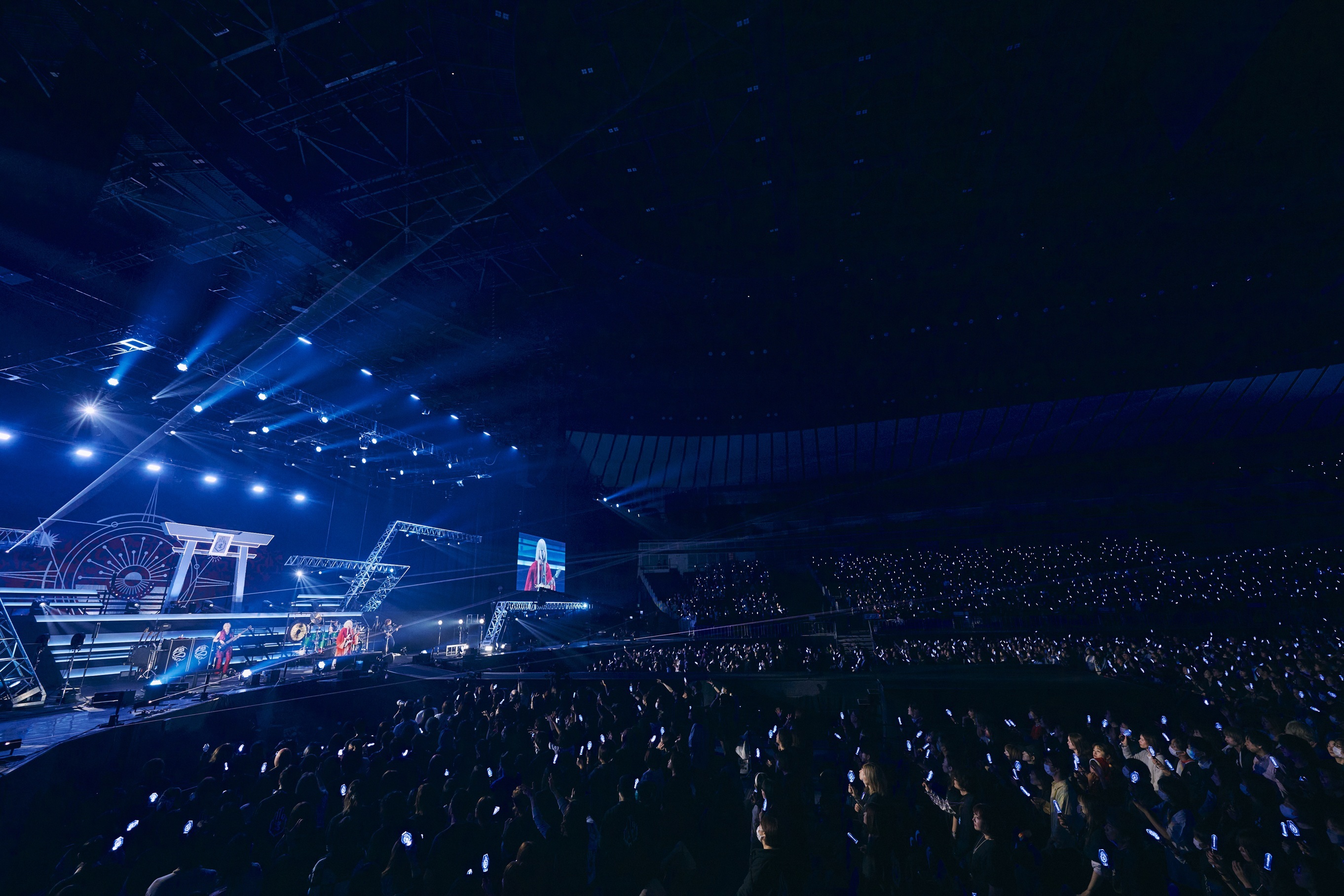 2023年11月に行われた東京ガーデンシアター公演のレポートで、このときが-真天地開闢集団-ジグザグ初体験だった自分は、「もっとやっちまえ」という言葉で締めくくった。そうしたらどうだ。もっとやっちまった結果、約1年後に行われることになった今回のツアーではホールを回ることになり、ファイナルの会場はなんと横浜アリーナ。しかも、3階席まで参拝者(-真天地開闢集団-ジグザグファンの呼称)でほぼ満員という大人気ぶり。いや、これは本当にすごい。客層は幅広く、場内に漂う空気も幸福感に満ちていた。彼らを取り巻く環境がポジティブに大回転していることが開演前から瞬時に感じ取ることができた。