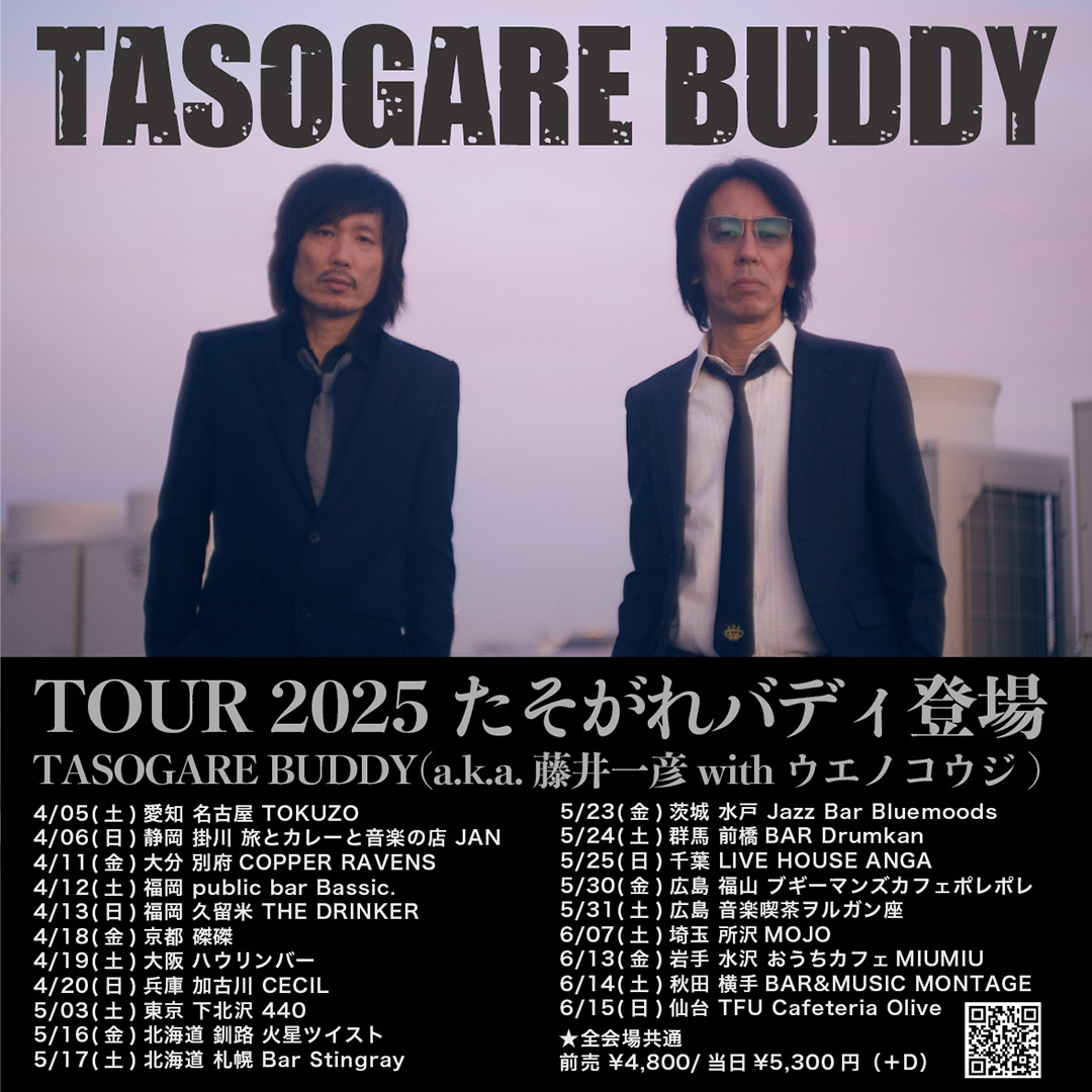 藤井一彦(THE GROOVERS)とウエノコウジ(the HIATUS、Radio Caroline)が、新ユニット「TASOGARE BUDDY」を結成し、4月5日(土)名古屋 TOKUZOを皮切りに、全国20本を巡るツアーが発表された。