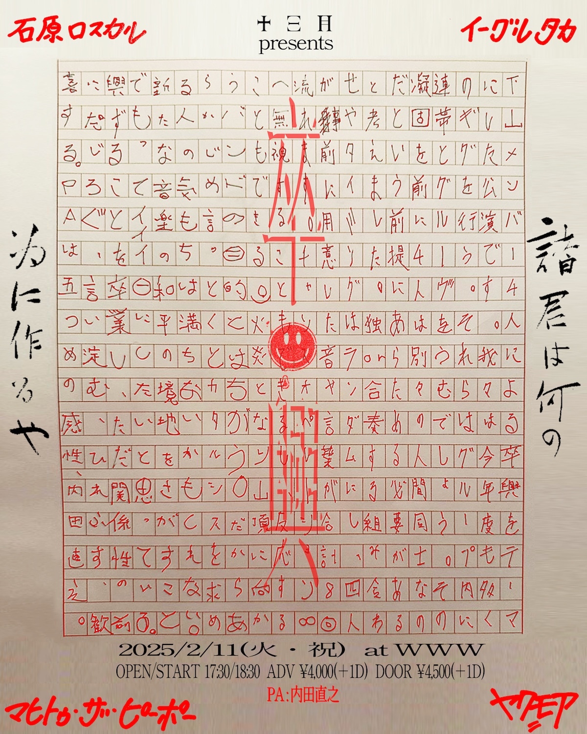 2月11日(火・祝)にGEZANメンバー4人がそれぞれソロで出演する、『卒興(≒即興)』をテーマとした公演が渋谷WWWにて急遽開催される。