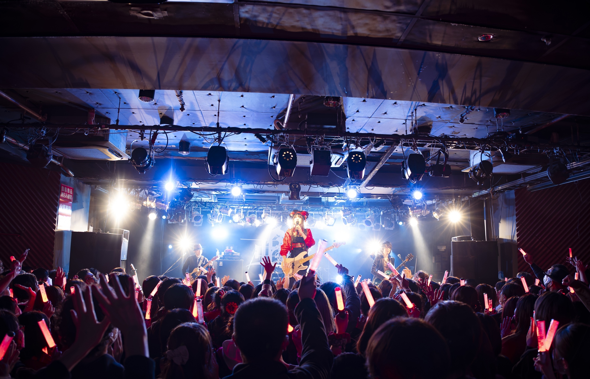 開演時間になると、亜沙のイメージカラーである赤いペンライトが一気に点灯。手拍子に迎えられて、まずバンドメンバーがステージへ。最後に亜沙が赤いチャイナドレス風衣装を纏って登場! 初新衣装のお披露目ということで場内からは歓喜の声が飛ぶ。声援を受けて亜沙は「盛り上がっていこう!」と煽り、1曲目の「ヴィジュアル系レッドラム」へ。彼はベースを弾きながら歌うベースボーカルのスタイルで、アッパーな曲を歌いこなしていく。2曲目には2017年にリリースしたアルバム『麗人オートマタ』のアルバムタイトル曲「麗人オートマタ」をプレイ。場内からは拳も上がり、ライブハウスならではの熱量が急激に上がっていく。3曲には2023年リリースの配信限定シングル「変身シンドローム」が飛び出す。どの曲にも言えることだが、彼の曲はどれも秀逸なメロディーを持つ。前半3曲で場内はすっかり温まっていた。
