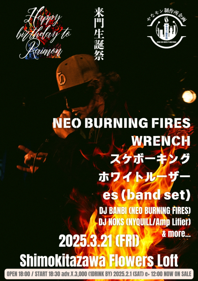 また、3月21日(金)に東京・下北沢Flowers Loftにて、『来門生誕祭』が行われることも決定。こちらには、NEO BURNING FIRESのほか、WRENCH、スケボーキング、ホワイトルーザー、es (band set)らが出演する。