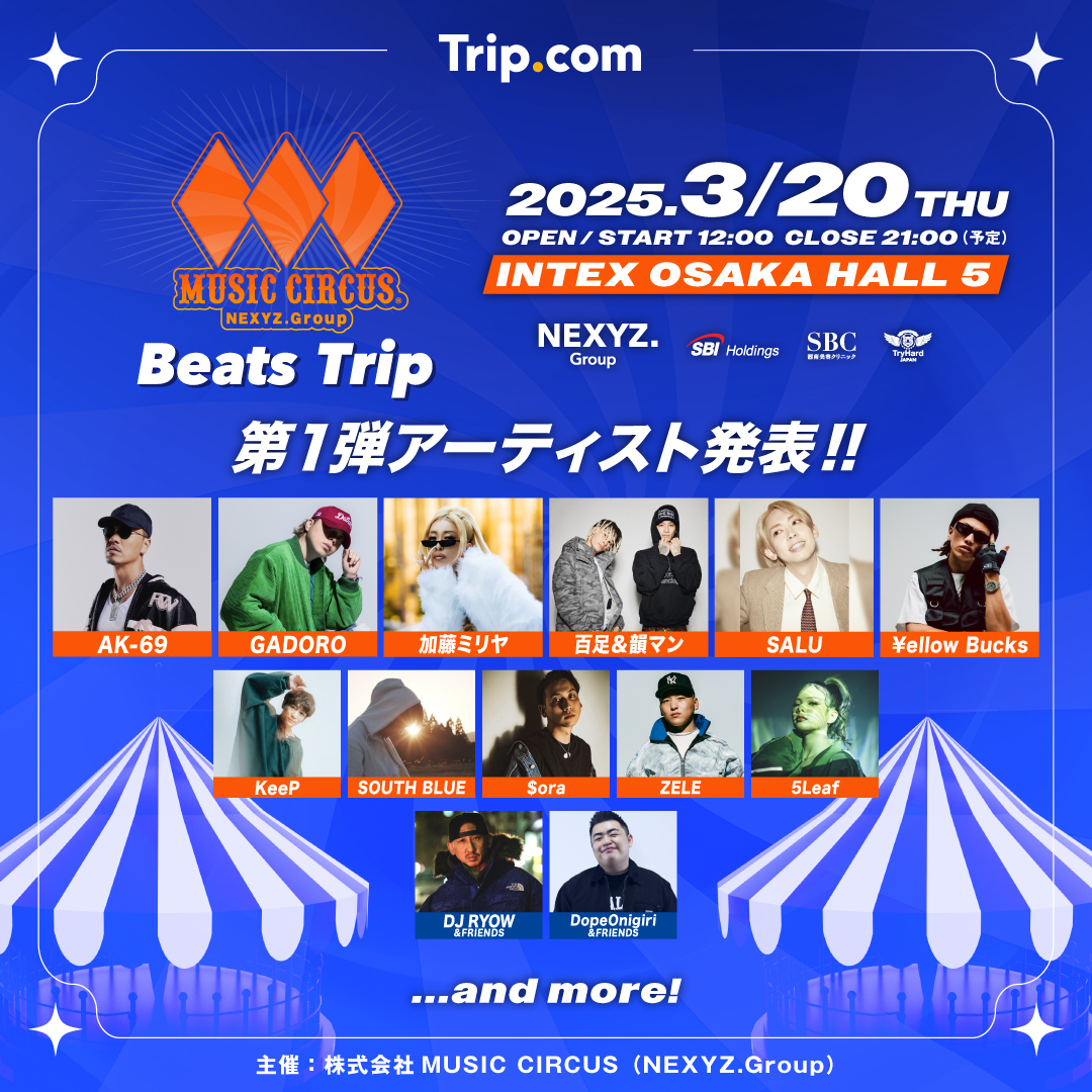 3月20日(木・祝)にインテックス大阪5号館にて開催される音楽フェスティバル『MUSIC CIRCUS -Beats Trip-』の第一弾出演アーティストとして、加藤ミリヤ、¥ellow Bucksら13組のアーティストとDJが発表された。