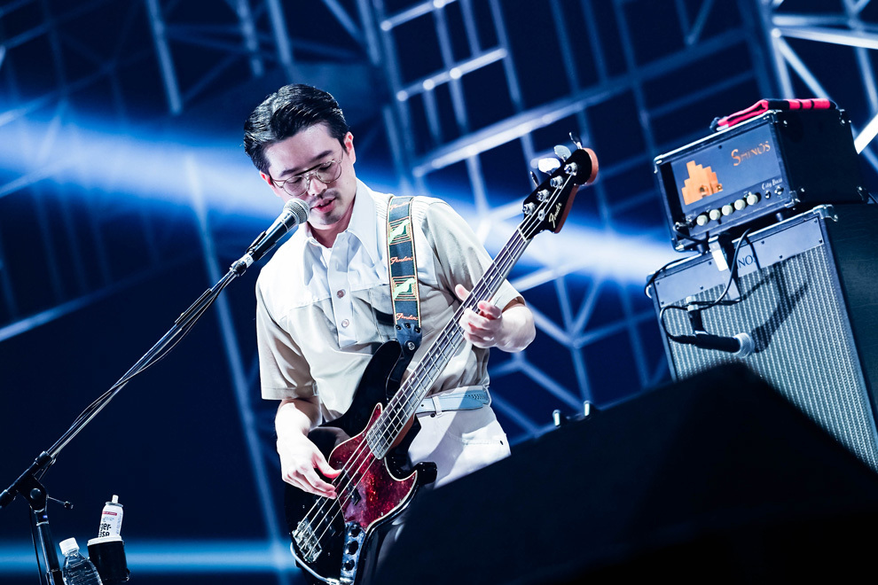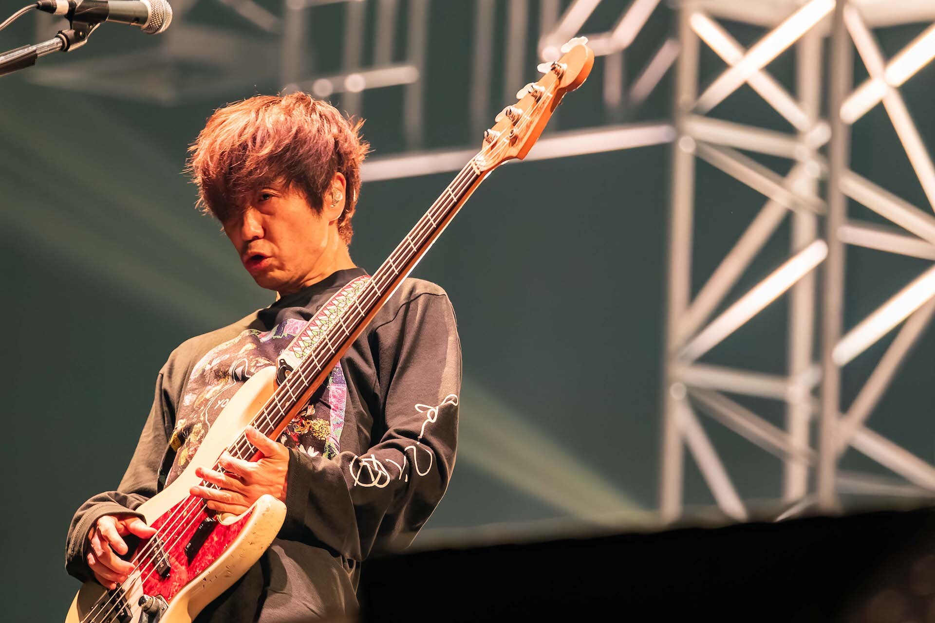 プラムチャウダーと幾つもの名演を作り上げてきた大トリのスピッツは、「春の歌」のとんでもない名曲ぶりで瞬く間に惹きつけたかと思えば、三輪テツヤ(Gt)が先導するキレのあるレゲエのリズムと﨑山龍男(Dr)の繰り出す疾走感に踊る「8823」と、緩急自在に魅せていく。「迷子の兵隊」~「正夢」とエバーグリーンな楽曲が続くゾーンでも、田村明浩(Ba)は息つく暇もなく縦横無尽に駆け回りエネルギッシュにアピール!