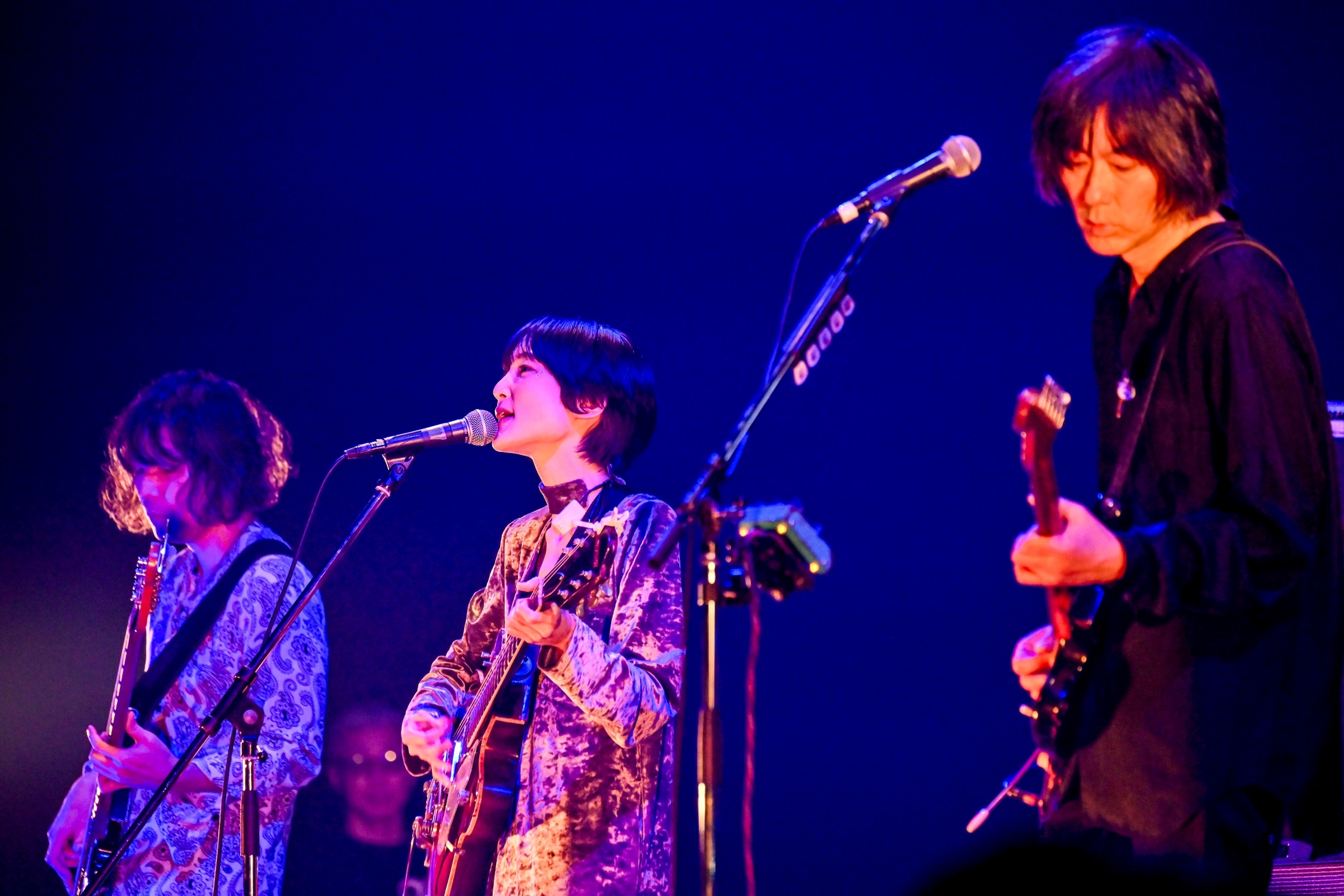 次に中野ミホと入れ替わりで現れたPUFFYが、祝いの装飾が施されたそろいのタキシード風ジャンプスーツ姿で、チバから楽曲提供された「君とオートバイ」を披露する。MCでは、旧知の仲というフジイとじゃれ合いながら「いつもはケンジって呼び捨てにしてます(笑)」(吉村由美)とにぎわせ、「PUFFYに曲を書いてくれた方々は続々とセルフカバーをするんですけど、本物がやったらそっちがいいに決まってるじゃん!」(大貫亜美)、「とは言え、負けじと今日も頑張って歌いたいなと思います、好きな曲なので」(吉村)と、またもチバの提供曲「誰かが」で、一時代を築いた二声を軽やかに響きわたらせる。