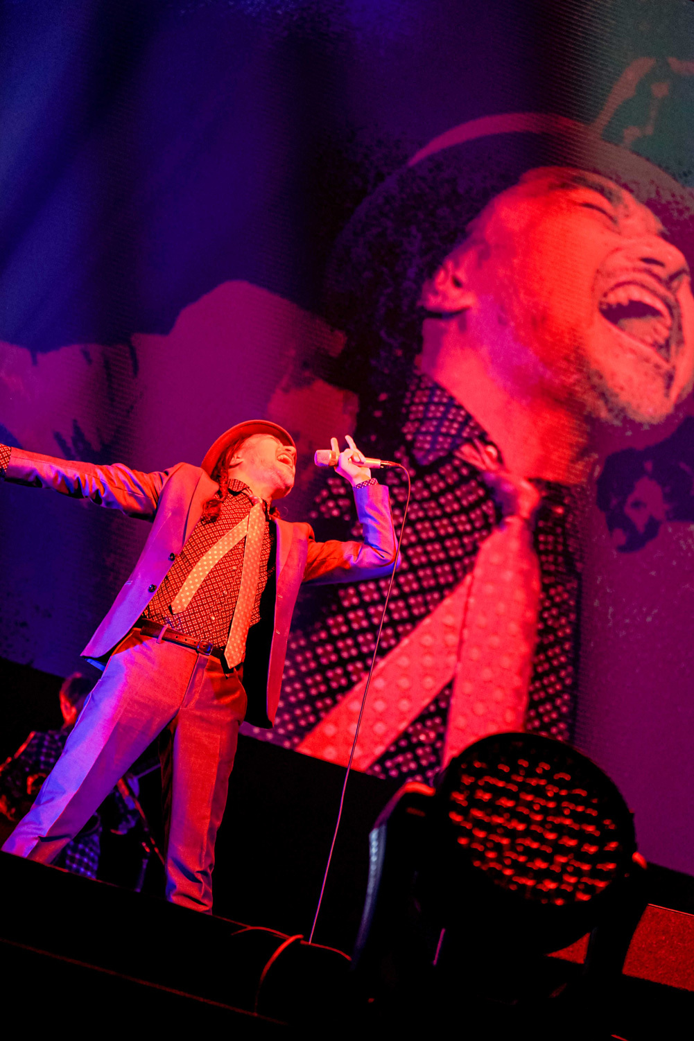 サンコンJr.(Dr)の強烈なドラミングに乗せ、「こんばんはウルフルズです、『グランドチャウデーション』楽しんでね~!」とトータス松本(Vo.Gt)が叫べば、いきなりの総立ち。なぜだろう、うろ覚えでもみんなができてしまう「バカサバイバー」のサビの振り付け(笑)。先ほどまでのムードをあっという間にガラリと変えたウルフルズは、ソウルフルな「愛がなくちゃ」でも城ホールを心地良く揺らしていく。