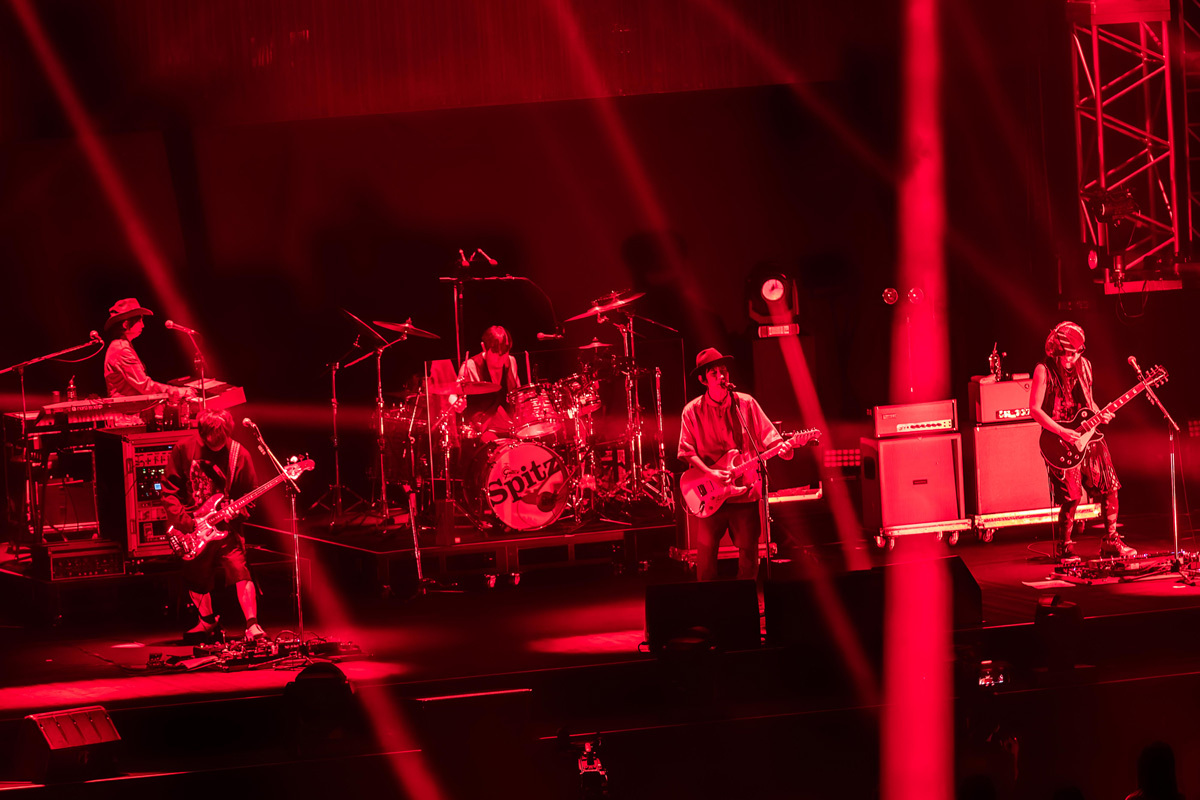 「プラムチャウダー20周年ということで、いろいろツアーでも世話になっているし、関西では『ロックロックこんにちは!』もずっと一緒に作ってきたんですけど、昔メンバーをシャッフルしてカバー曲をやったんですよ。俺がボーカルでギターがThe Birthdayのフジイくん、ベースが明日出るMr.Childrenの中川(敬輔)くんで、ドラムがうちの﨑ちゃん(﨑山龍男)で……やった曲がウルフルズの「ツギハギブギウギ」だったんで、今日は何か縁を感じて。歌えと言われたら歌えそうだけど、多分フジイくんは忘れてると思うよ(笑)」と、当時を振り返った草野マサムネ(Vo.Gt)は、「スピッツは3カ月ぶりぐらいのライブなので力の入れ具合がイマイチ分かってなくて、今までの4曲で結構パワー使ったよね?(笑)。まだまだまったりやりますんで、皆さんも自由に楽しんで、最後までよろしくお願いします」と、気心知れた仲間が多くそろった久々のライブに、何だかうれしそうな表情。
