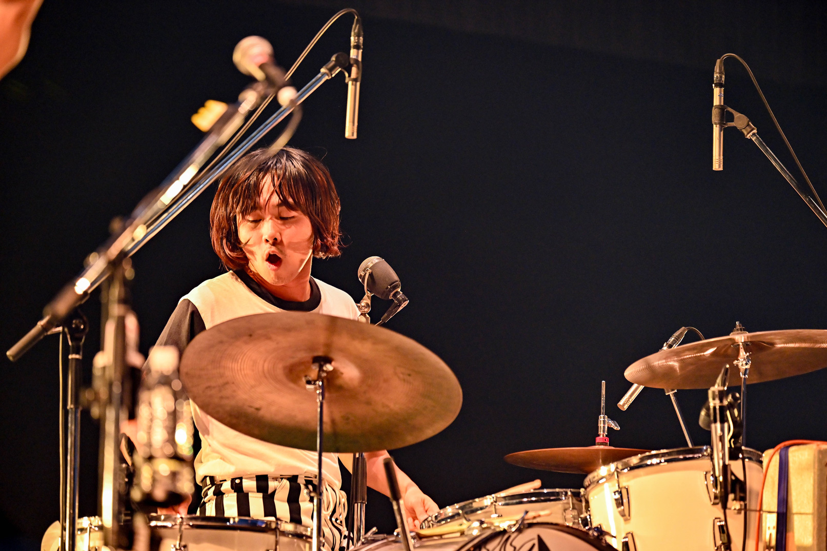 「プラムチャウダーから受けた愛情に、こうやって感謝できたらいいなという新曲があるので」とオカモトショウ(Vo)が告げ、1月22日(水)リリース予定のニューアルバム『4EVER』から「ありがとう」をいち早く聴かせ、真摯なメッセージを際立たせるコーラスワークと、メンバー各人の高いプレイアビリティに思わず見惚れてしまう。