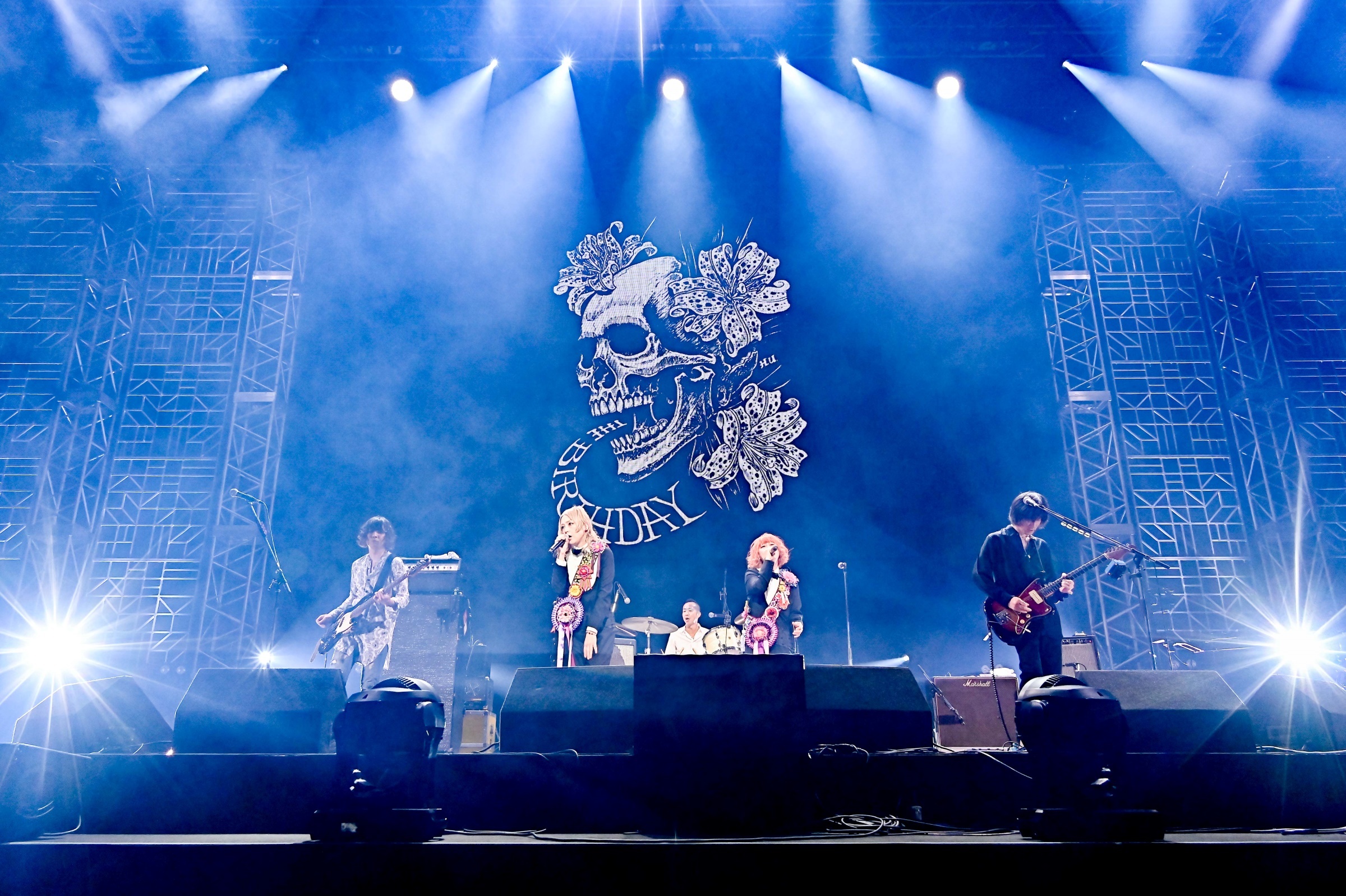 「こんばんはThe Birthdayです。今日は素敵なゲストをお迎えしてやらせていただきます。事務所の後輩、中野ミホ!」とクハラがコールすれば、シルバーグレーのドレスを身にまとった中野ミホが登場。生前のチバユウスケ(Vo.Gt)もかわいがっていた彼女は、Drop‘sの休止後はシンガーソングライターとして活動。大阪城ホールというキャリア最大級の舞台でも物怖じすることなく、歴戦の猛者どもに囲まれながら「プレスファクトリー」を可憐に歌い上げる。