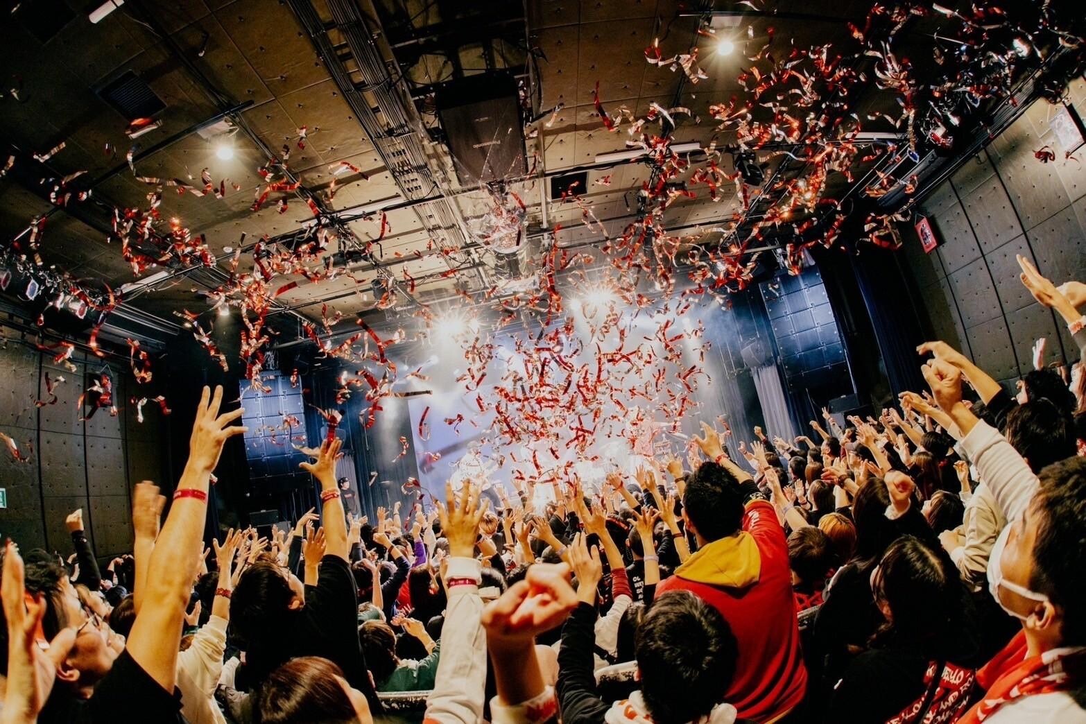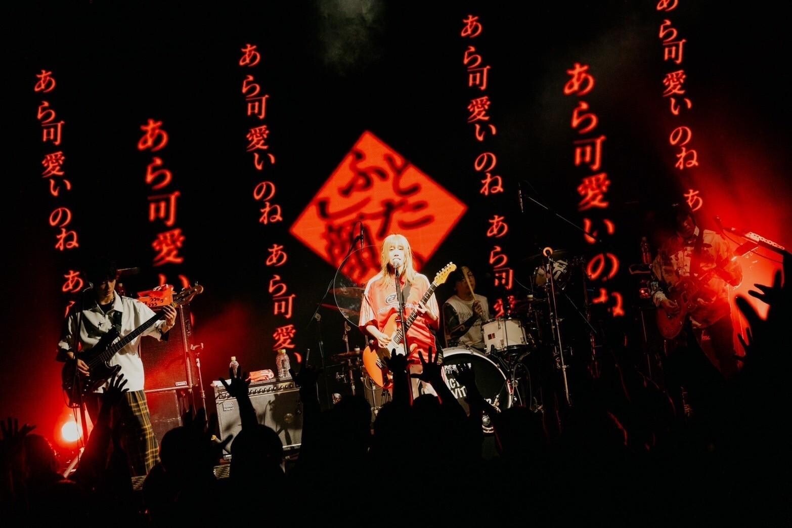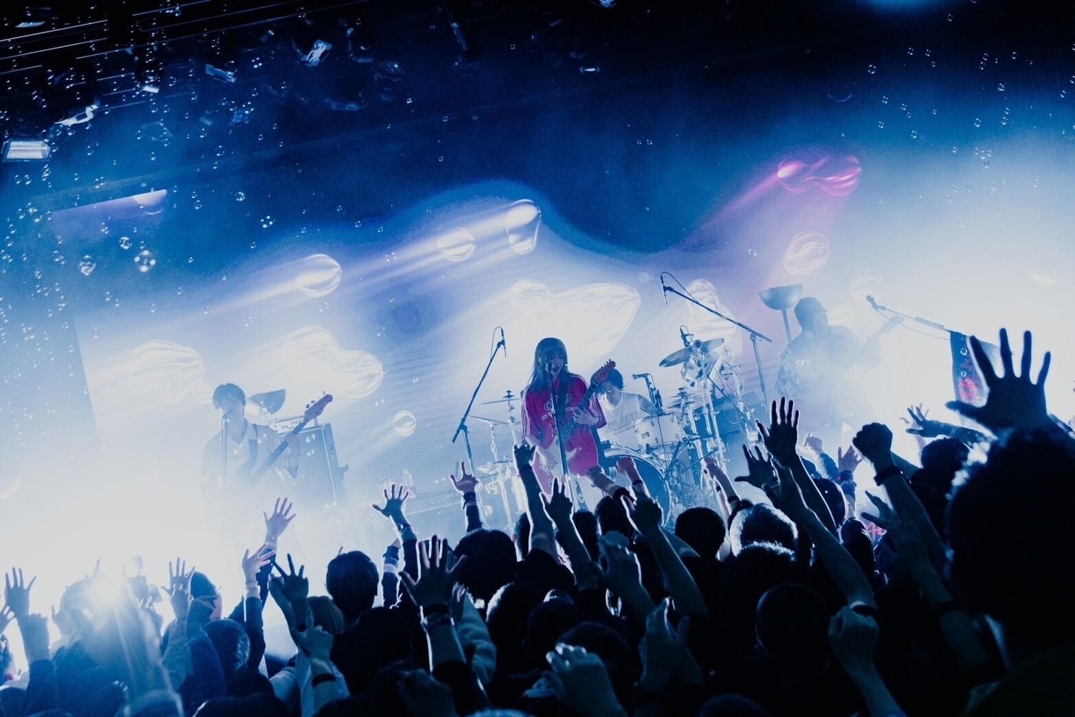 今日はスタートの日ですーー。岩淵の力強い宣言からの「化かし愛のうた」は、満場一致のクラップを集めてダンサブルに。「浮気をするならバレずにやれよ」は、一瀬貴之のメタリックなギターリフで思い切りヘヴィに。「パッパラパー」ではバブルマシーンが大量のシャボン玉を吹きだし、ミラーボールがきらきら回る。タイポグラフィの演出で、スクリーンにでかでかと歌詞が出るからみんな歌える。♪パッパラ~のコーラスでファンの気持ちが一体化する。
