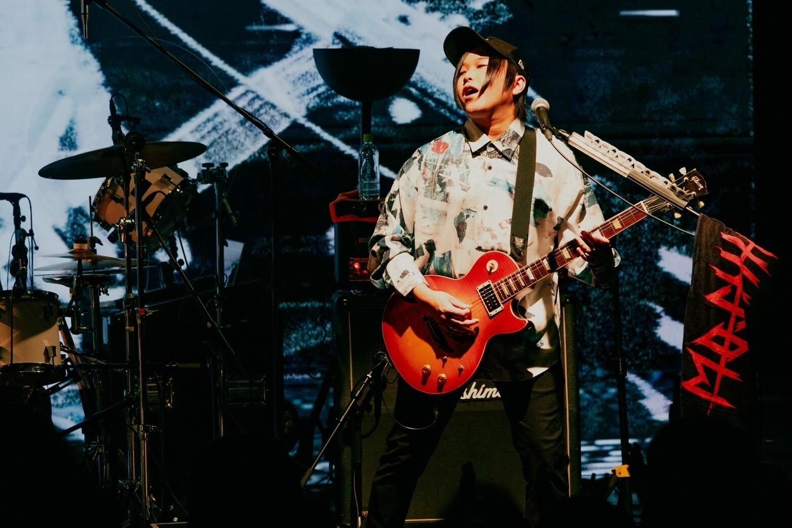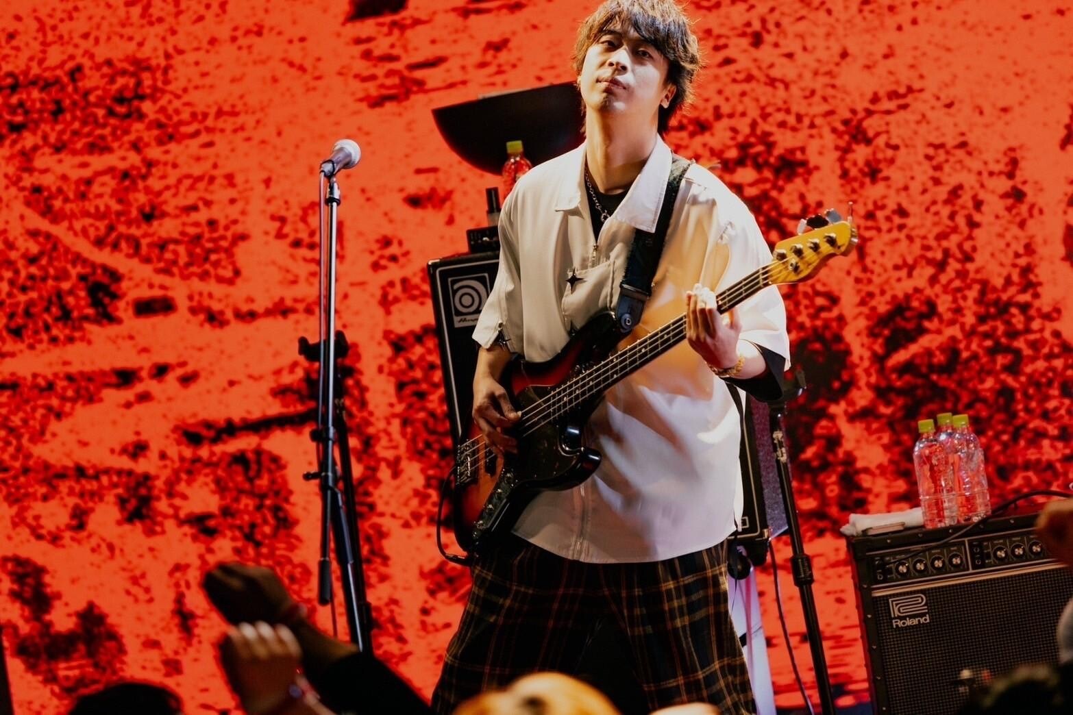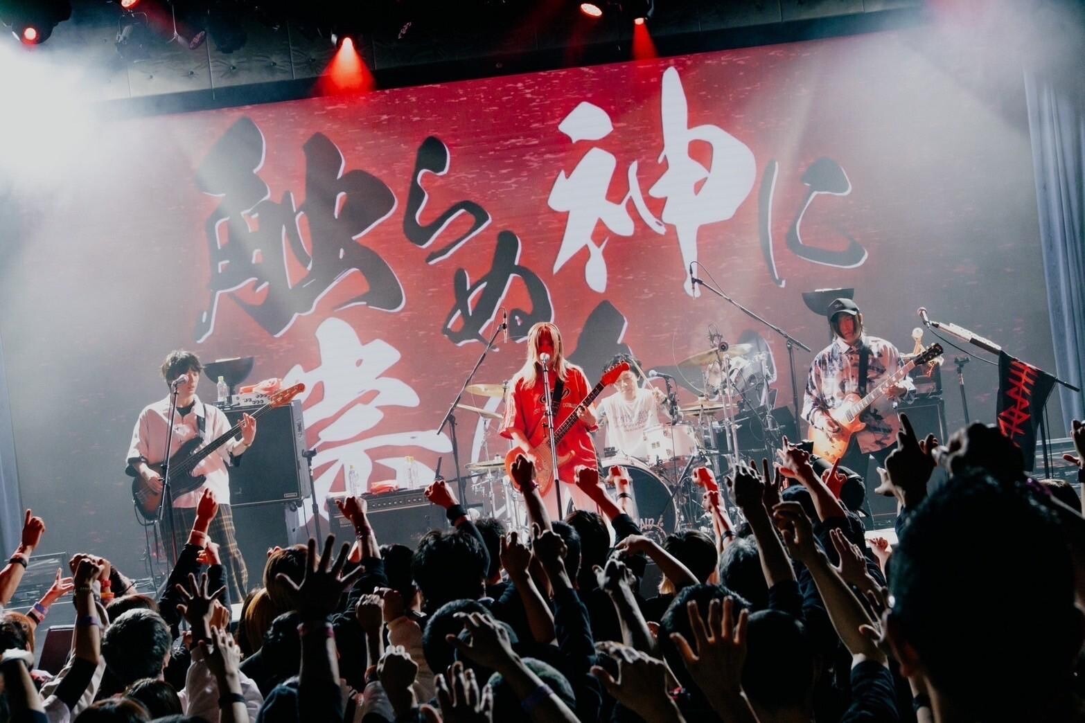 今日はスタートの日ですーー。岩淵の力強い宣言からの「化かし愛のうた」は、満場一致のクラップを集めてダンサブルに。「浮気をするならバレずにやれよ」は、一瀬貴之のメタリックなギターリフで思い切りヘヴィに。「パッパラパー」ではバブルマシーンが大量のシャボン玉を吹きだし、ミラーボールがきらきら回る。タイポグラフィの演出で、スクリーンにでかでかと歌詞が出るからみんな歌える。♪パッパラ~のコーラスでファンの気持ちが一体化する。