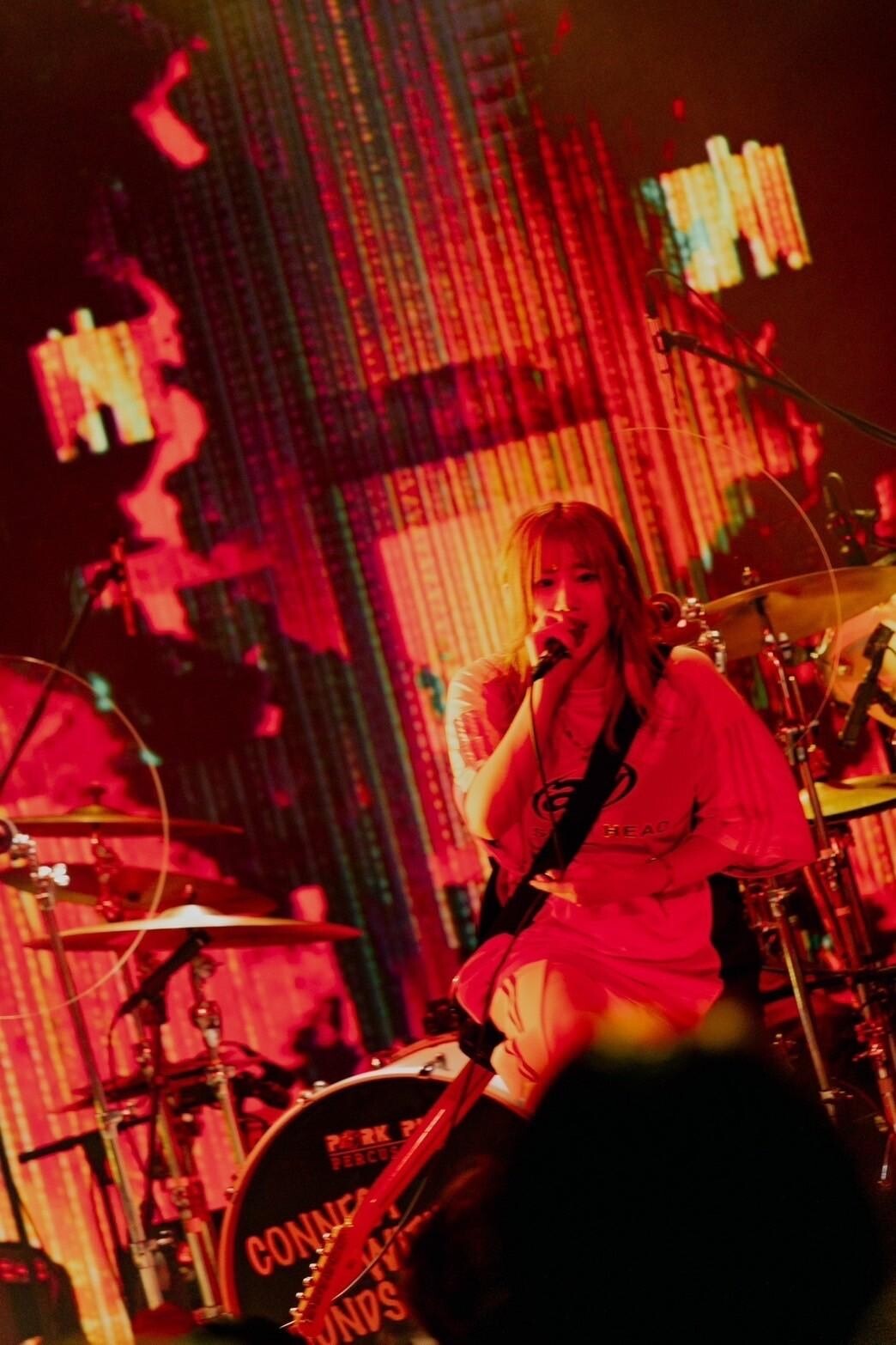 笑顔満面の岩淵紗貴がマイクをつかみ、気合満点の激しいバンドサウンドに乗って叫ぶ。挨拶代わりのオープニングセッションから1曲目「もっと」へ、メタルバンドか?と思うほどの音圧がいきなり凄い。背後の全面スクリーンに映る生ライブ映像の迫力が凄い。岩淵がギターを構えて「ヤダヤダ」「やなこった」へ、豪快ダンスロックと直球パンクソングを畳みかけてぶっとばす。マシーンか?と思うほどの高速ツービートで高島一航のドラムが突っ走る。