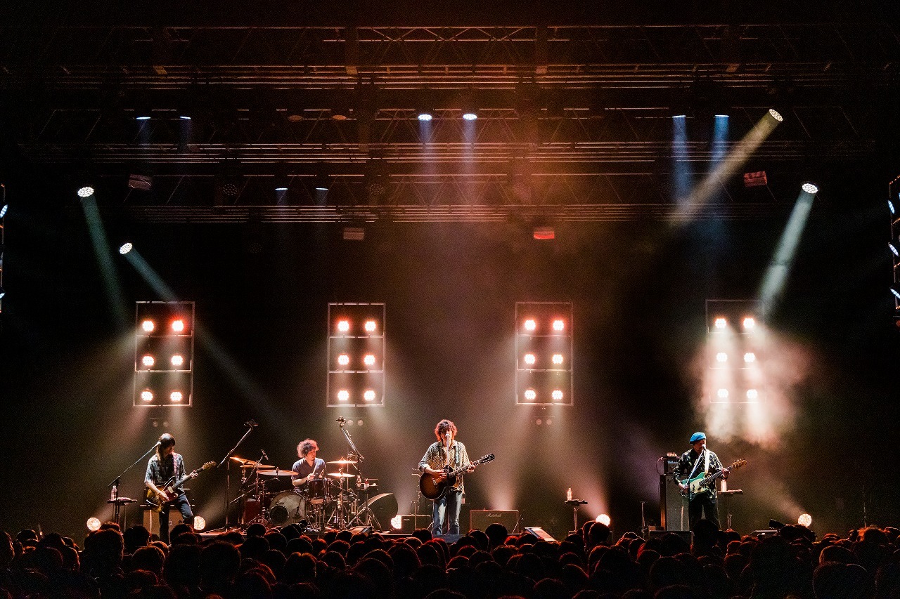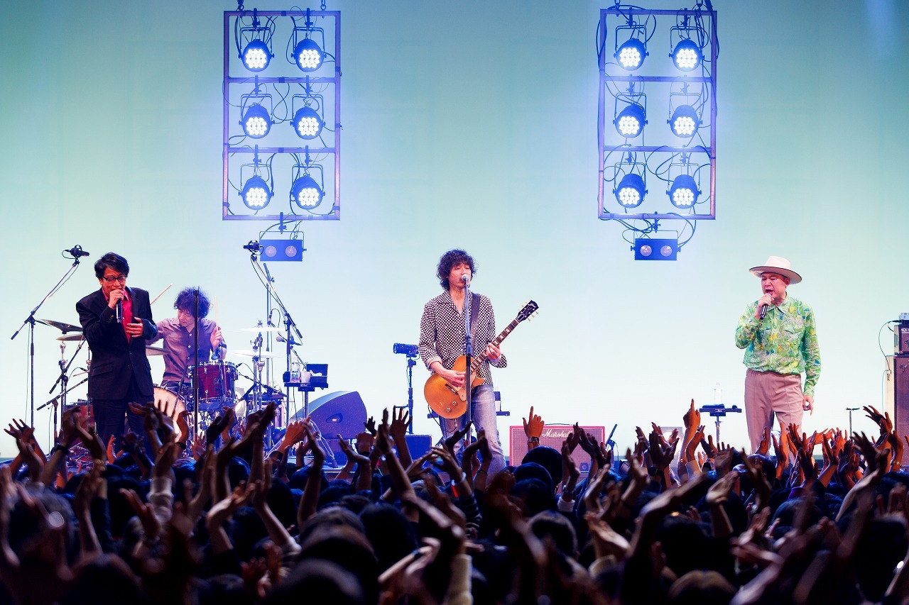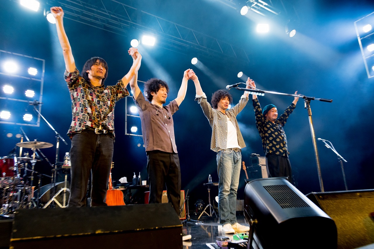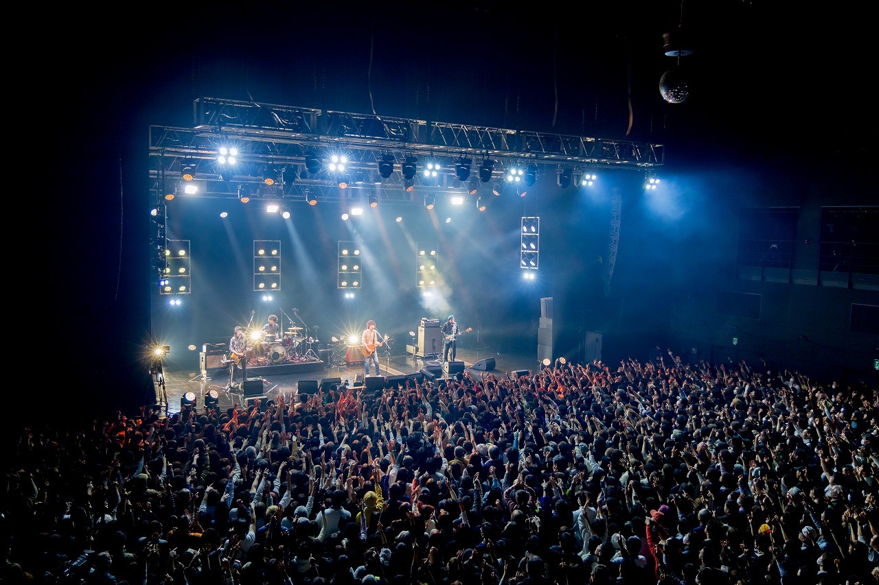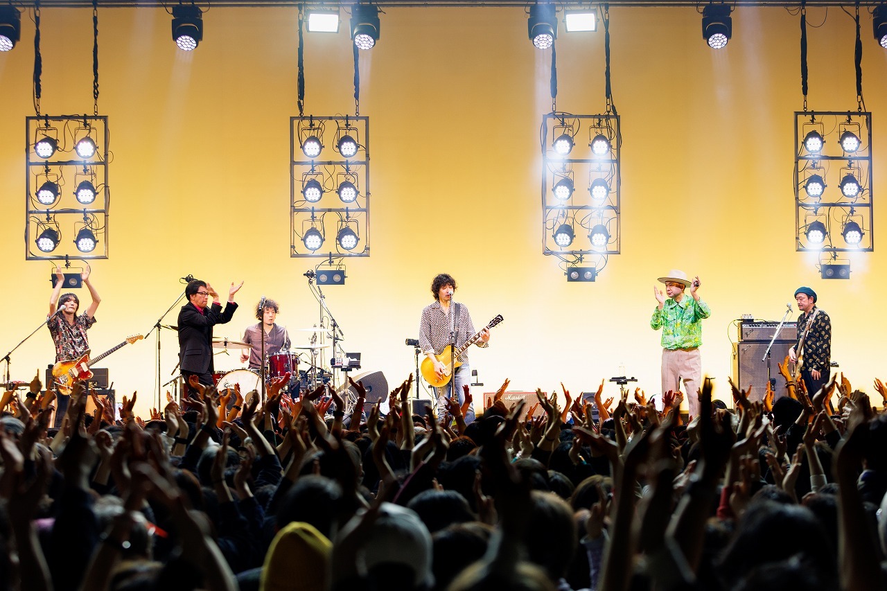 イントロのディレイが鳴り響いて、「やさしくなりたい」へ。ストレートな演奏にこみ上げるメロディが胸を打つ。乾いたテレキャスターのストロークも心地良いパワーポップ「Boy」でミラーボールが回り気分を盛り上げる。玉田がおなじみのあのリズムを叩き出すと、斉藤が「じゃあ、もう一度紹介しましょう!」と浜崎、岡村を呼び込んで、「歩いて帰ろう」を全員で歌唱。爆音でギターを鳴らしながら歌う斉藤から浜崎、岡村へとマイクリレーして、オーディエンスに歌を委ねる3人。会場中が歌声で応えると、最後はステージと客席が一体となるさらなる大合唱となった。