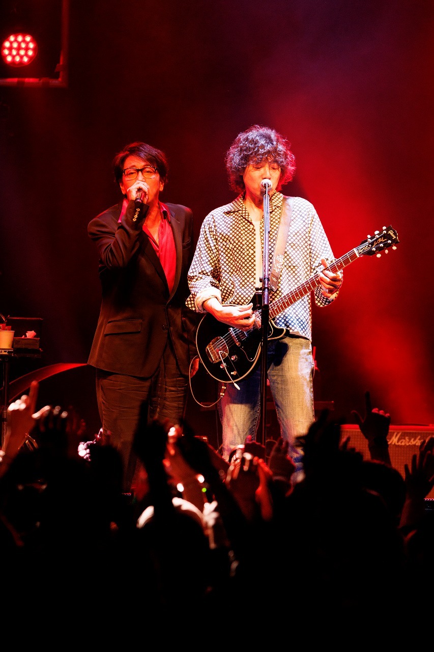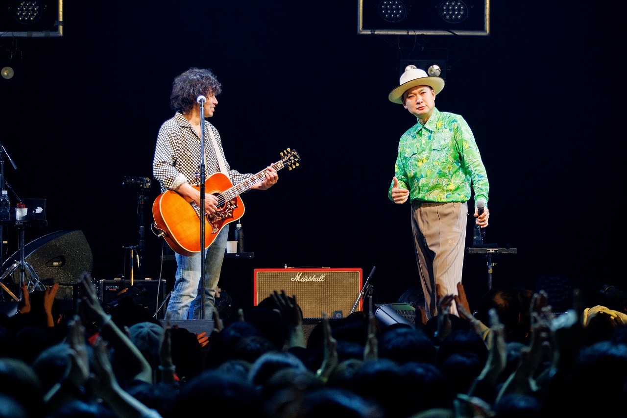 浜崎がステージを降りると、斉藤がエレキギターを弾きながらバンドはファンキーなセッションを開始。しばらくすると下手袖から岡村靖幸が登場して、「うぉ~!」と怒号のような歓声で沸き立つ場内。黒いスーツに赤いシャツのファッションで、「ハネダ! 準備は出来てるか? いくぞ! 1、2、3、4!」と叫んだ岡村のカウントを合図に、2人のユニット“岡村和義”の「春、白濁」へとなだれ込んだ。岡村が斉藤の肩に手を回しながら、《嗚呼 キミよ 幸せであれ!!》と声を合わせる。斉藤のギターソロの間、岡村はステージ端まで移動してフロアを挑発。スーツをバッとはだけるアクションに「キャ~!」と嬌声が上がるなど、とてつもない盛り上がりとなり、最後は1マイクで歌い上げて曲を終えた。「本当にゲスト無しで、と思っていたんだけど、“どうして誘ってくれないんですか? 寂しいじゃないですか”と言うので、“じゃあ来る?”っていうことで。ありがとうございます」と、浜崎と同じタイミングで声をかけてくれたことを明かす斉藤。また、“岡村和義”のデータのやり取りはしているそうで、今後の活動への意欲をのぞかせた。先ほどとは一転してメロウなバラード「サメと人魚」のデュエットで酔わせると、斉藤が泣きのギターソロでエンディングへと導いて、大喝采の中で岡村はステージを後にした。
