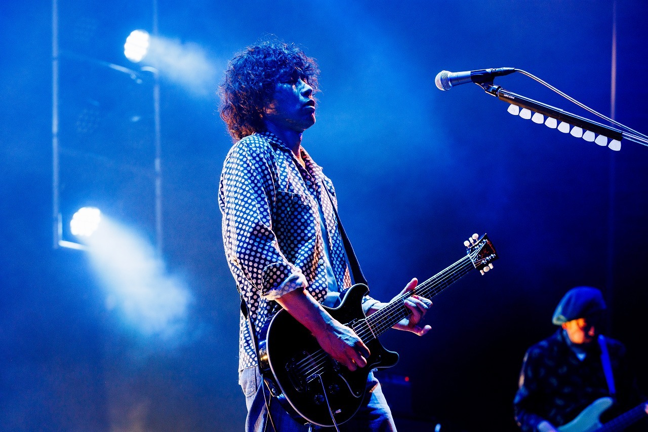 会場となったZepp Hanedaは1Fスタンディングフロア、2F客席までギッシリとお客さんが詰めかけた。BGMのウッドベースの音に合わせて手拍子が自然発生すると、ほどなくして場内が暗転、拍手と声援に迎えられて斉藤和義(Vo.Gt)、真壁陽平(Gt) 、隅倉弘至(Ba)、玉田豊夢(Dr)の4人がステージに登場した。斉藤がギターをフィードバックさせると、歪んだ低音リフを弾き始めてバンドの音が加わり、「Are you ready?」からライブがスタートした。緊張感のあるラウドなサウンドに乗せて斉藤が《Are you ready? Are you ready?》と繰り返し歌うと、客席からステージに向かって拳が上がる。「Hey!ハネダ!」と煽ると歓声が上がる。《Are you ready? 飛び込め ネットなんかに出てないぜ》《本当に欲しいものは エキサイトする心臓だろ》と歌うパンチラインも熱いオープニングだ。アウトロのバンドのキメに合わせて「Hey! Hey!」と会場中がレスポンスすると、ゴールドトップのレスポールに持ち替えた斉藤が「Hey東京~!」と叫んで「罪な奴」へ。4人のパンキッシュな演奏が爆発的に疾走する。ブルージーなリフからロックンロールリフを弾き出した斉藤は「ようこそ~!」と客席に声をかけながら「ずっと好きだった」を歌い出した。エフェクトのかかったレトロなニュアンスの斉藤のギターの音色、真壁が弾くスライドギターが歌詞にリンクしたノスタルジーを演出する。終盤、「Hey東京ー!」と煽る斉藤と声を合わせて《ずっと好きだったんだぜ》と歌うオーディエンス。甘酸っぱく切ない余韻をかき消すように、「Stick to fun! Tonight!」へと突入すると、真壁の幾何学的なリフ、玉田の重たいドラム、隅倉の太いビートが作り出す混沌としたサウンドの中、斉藤がエモーショナルなソロを弾いた。
