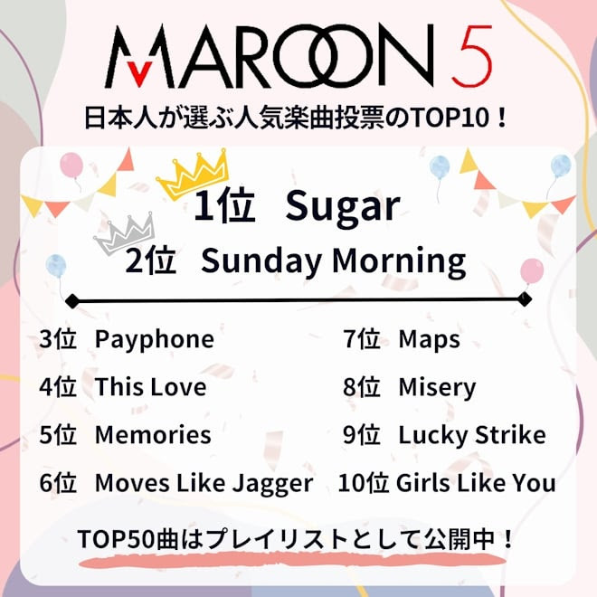 2月6日(木)、8日(土)、9日(日)の3日間、東京ドームで来日公演を行うマルーン5。この来日公演を記念して、1月6日から1月26日にかけて実施され、2万4,532票が寄せられた楽曲人気投票の結果が発表となった。