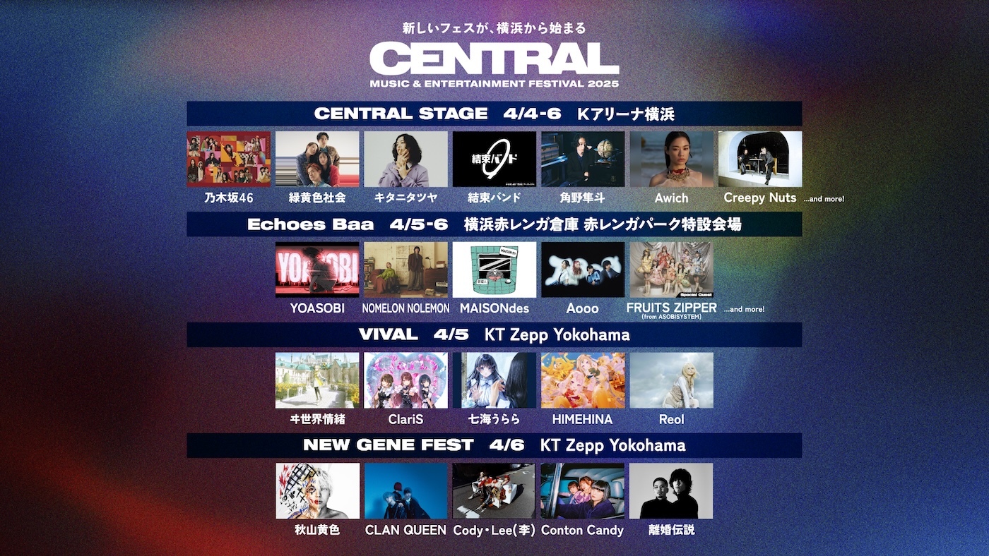 『CENTRAL』は、Kアリーナ横浜、横浜赤レンガ倉庫 赤レンガパーク特設会場、KT Zepp Yokohama、臨港パークの4カ所を会場に、横浜全体を巨大なフェス空間にするイベントで、これまでに乃木坂46や緑黄色社会の出演、YOASOBI、MAISONdesを擁する新レーベル「Echoes」主催の「Echoes Baa」の開催が発表されている。