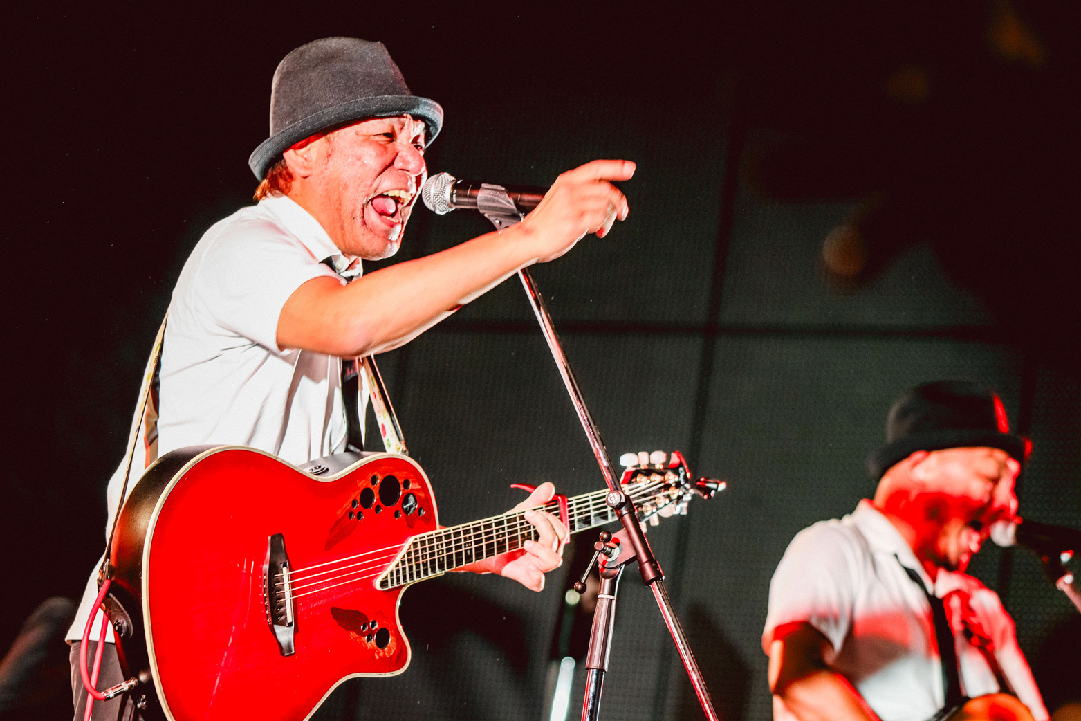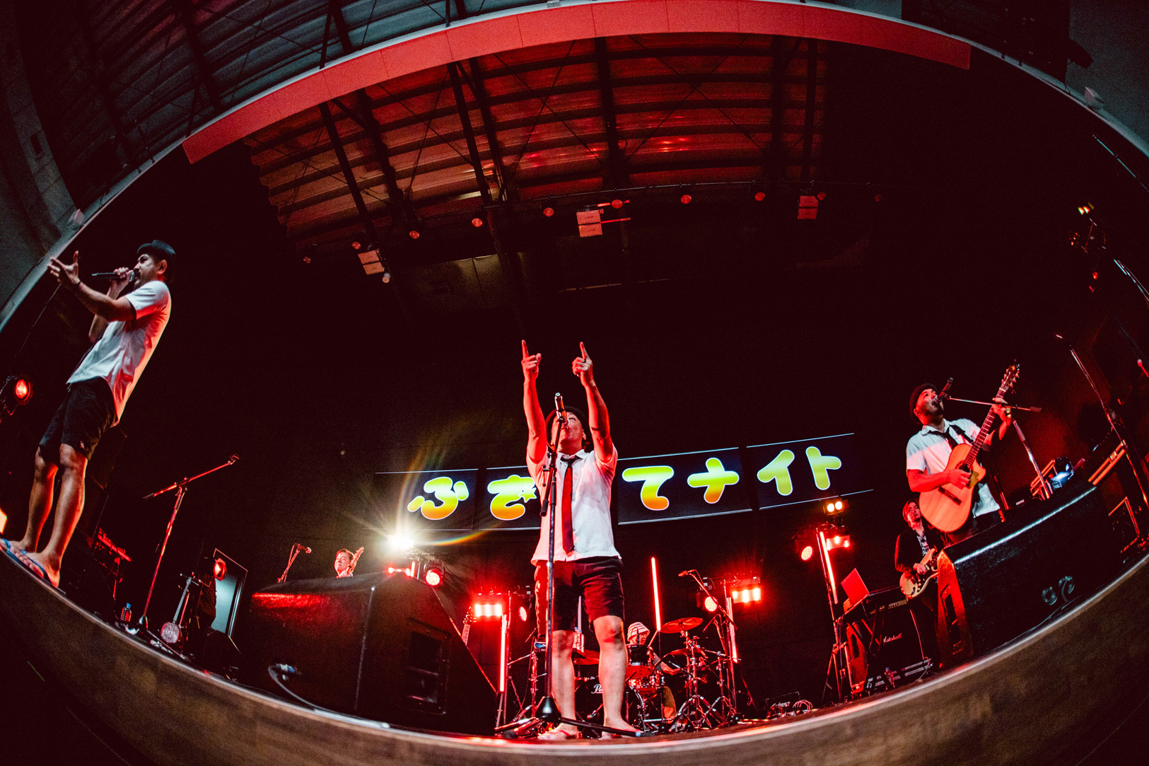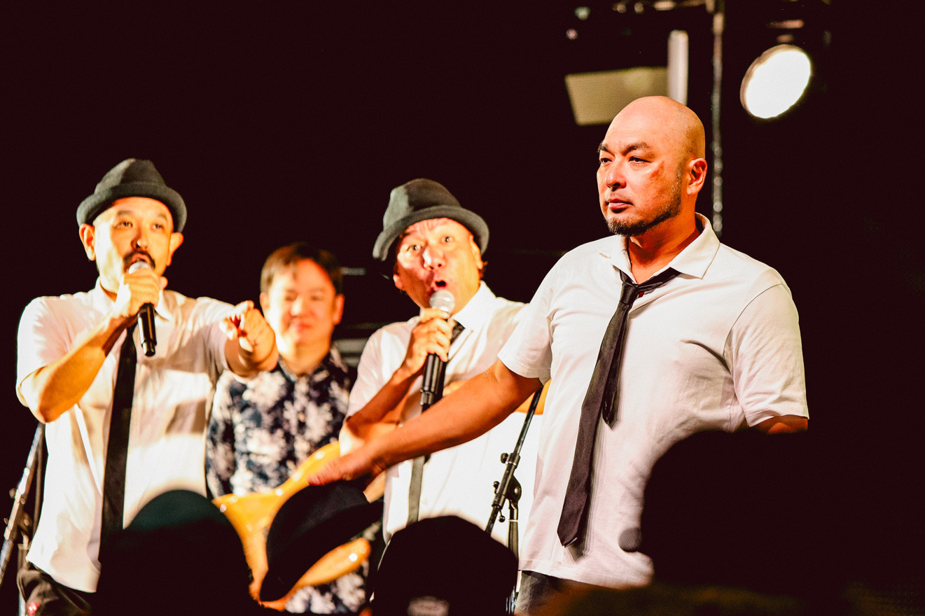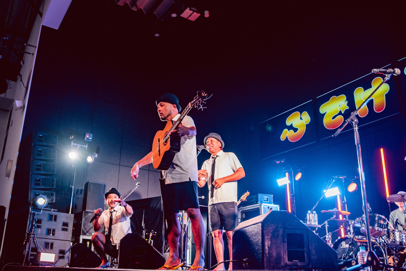 朝10時。沖縄民謡的な登場SEから、いきなりEDMみたいなダンスミュージックへと変わり、沖縄は石垣島出身のリョーサ・マスト・だいちゃんという兄弟と従兄弟の3人組が踊りながら現れる。いきなり「浪漫飛行」という90年代大ヒット曲のカバーからぶちかます。これロマンチックナンバーなのにぶちかますと書いたのには理由があって、当初は私もライブを観たことがなかったので、イメージ的にアコースティックな緩やかで穏やかなイメージを勝手に持っていた。ところがリハを観るとフルバンドであり、バッキバッキの演奏だったので驚いたのだ。康雄に聞くと、四星球もメンバー3人でのライブでしか対バンしたことがないが、「今日はバンドで来たい」と言われたそう。それだけの真っ直ぐな想いはリハから感じた。照明や音響を使って遊んで観客を巻き込んでいくパフォーマンスも何が何でも盛り上げようという意気込みを感じたし、ラストナンバーがロックンロールなのも格好良かった。