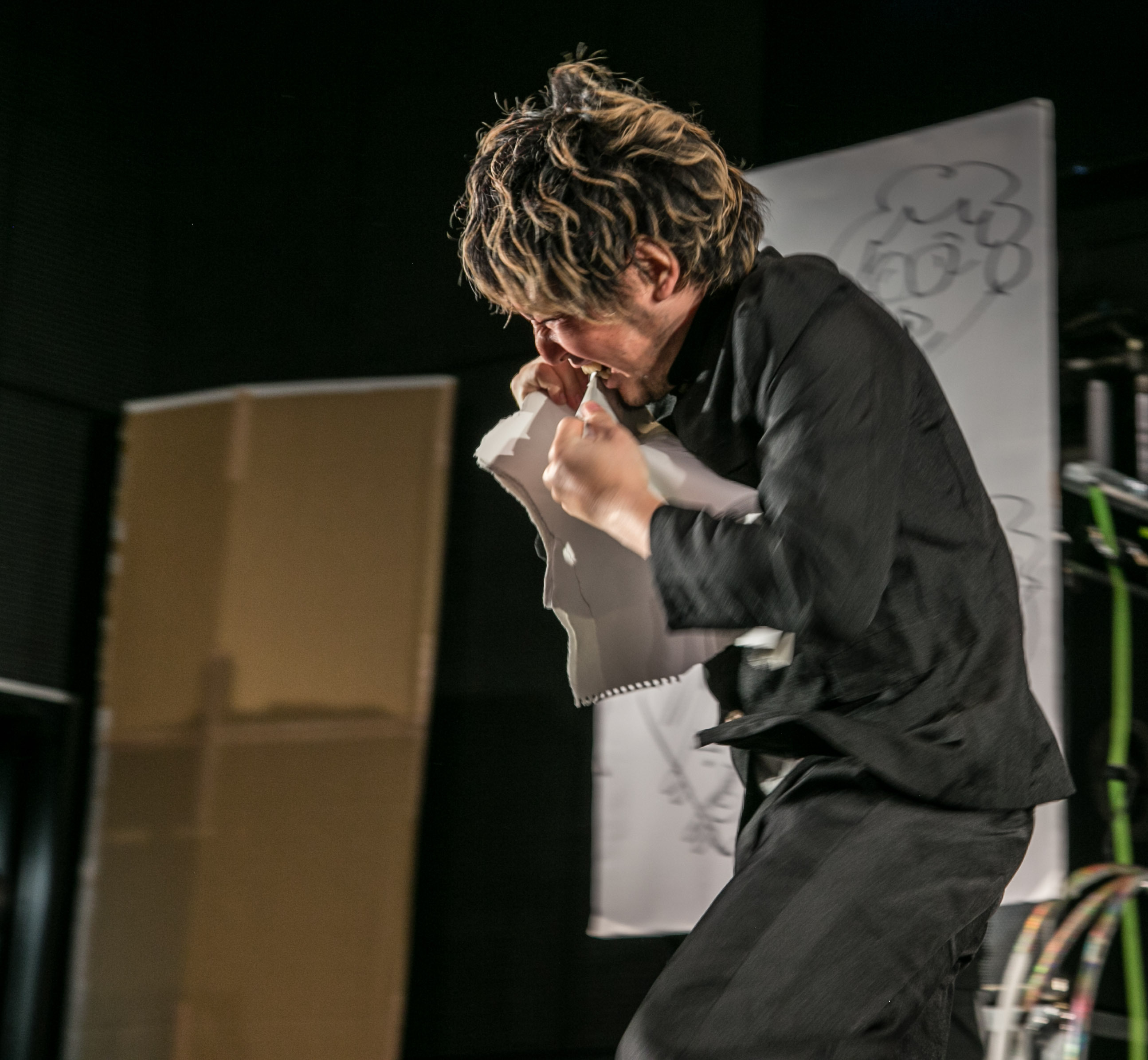 「FLAG」では康雄が、この場合はボーカルを務めるちょんまげマンが赤い旗と白い旗を上げて歌うのだが、観客にも何かしら赤い旗を配ることに。ここで最初にモリスがビリビリに破いたスケッチブックが白い旗の替わりとして役立つ。では、赤い旗はどうするのかと思っていたら、三井が流した鼻血を受け止めたバケツを持ってきて、スケッチブックをビリビリに破いた白い紙を赤く染めていく。芸が細かいというか、何というか、とにかく感心してしまう。例えば、この流れも台本に書かれている。或る意味、その通り行われているのだが、肉付けされるというか、文章だけの平面で読んでいるのとは違って目の前で立体化されると流れを知っているはずなのに感動してしまう。もう完全にバンドのライブの域を超えている。