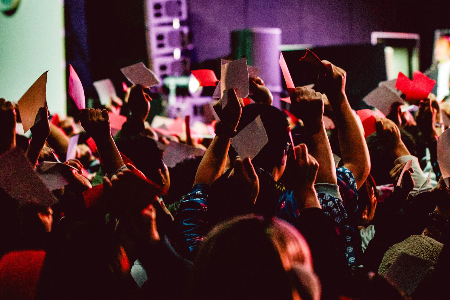 アンコール。最初にも同じ様なことを言っていたが、「ワンマンは頭を使うやつが多いですけど、今日はバカバカしく」なんて呑気に改めて康雄が言うが、ライブでの何でもない言葉や何でもない出来事が全て「ふざけてナイト」歌詞と同じで繋がっていたという伏線回収という名の検証が行われる。本当に四星球のライブは気が抜けない。でも決して小難しくなくて、おもろい。大丈部という部活として紹介されて、「大丈夫」という歌詞が肝となる「ノーフューちゃん」が歌われたり、粋を感じさせるのも四星球。最後は観客に赤い旗と白い旗として配った紙をちぎってもらい紙吹雪にしたりと大団円。
