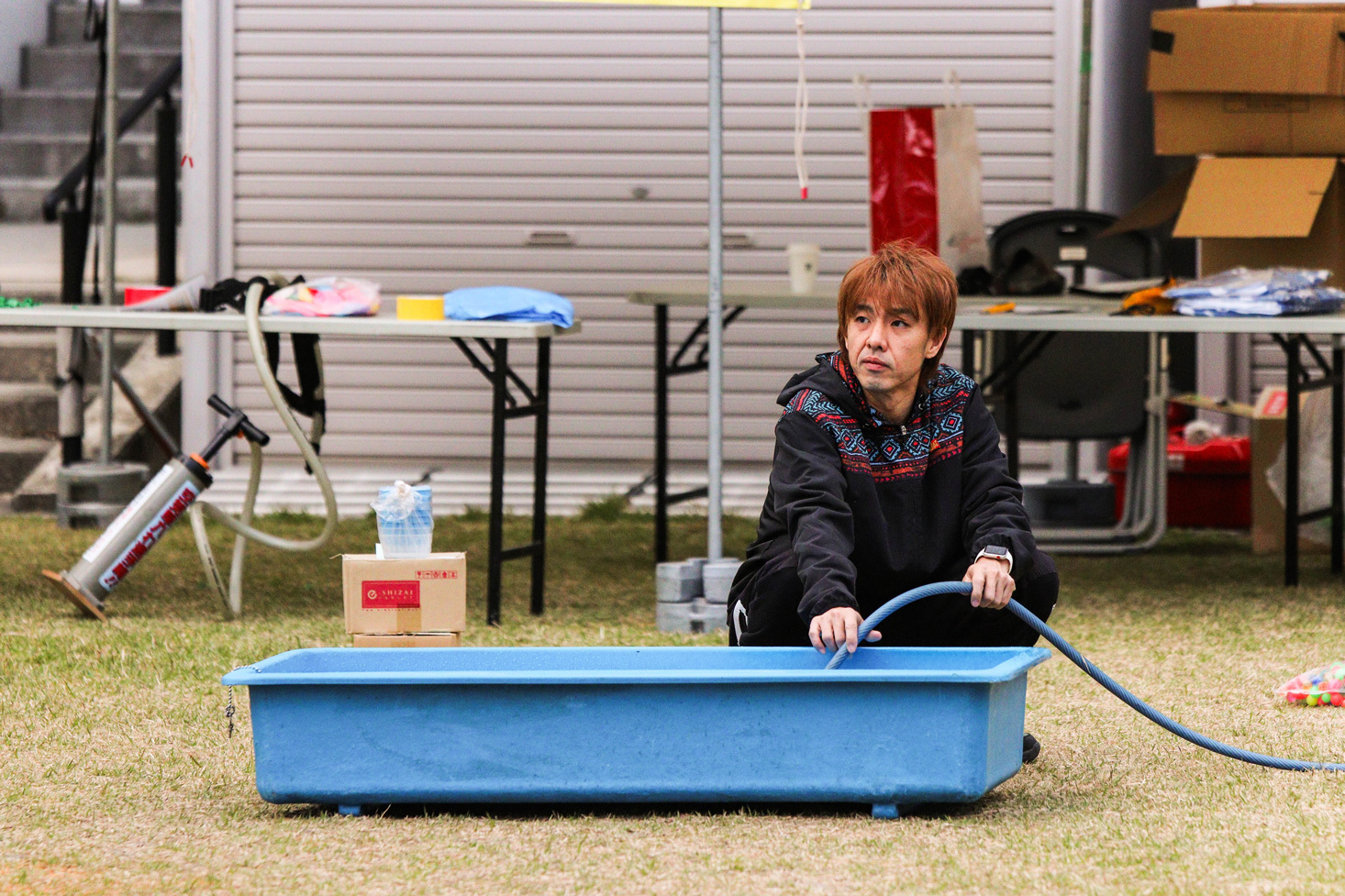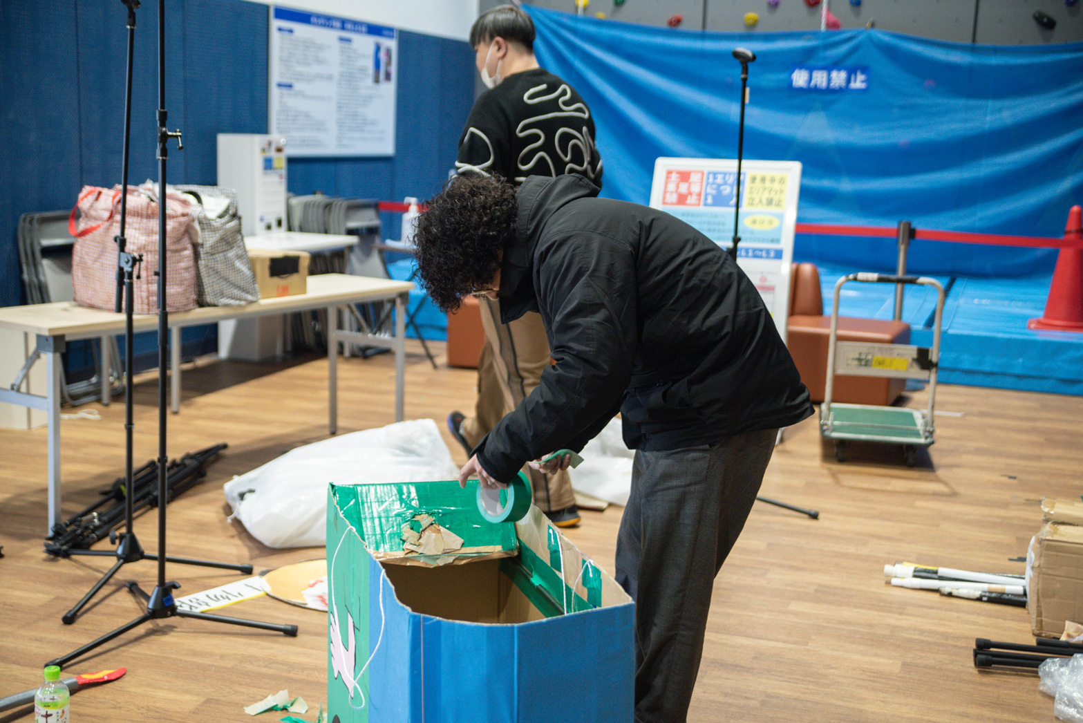 まるで学校の体育館みたいな”UZU HALL”を中心に、BOAT RACEに来場される観客用のフードコートやコンビニや展示やコンパクトな舞台も設置された”なるちゃんホールステージ”、そして、そのふたつのホールの間にある芝生広場と敷地内を目一杯に使用する。まるで学園祭みたいな催し物だが、初日は、その名の通り『令和6年度四星中学校文化祭』。この場所がぴったりな催し物だが、関西在住の私は2023年の前回同様に高速バスで高速鳴門まで向かい、そこから徒歩。入り口がガラス張りで中身丸見えのUZU HALLは早朝からの仕込みが終わり、昼1時からのリハーサルが始まるところ。北島康雄を中心に、スタッフ全員が床に座り、片手には台本が持たれている。四星球のライブは仕掛けが多いため、構成演出の流れが事前に紙にまとめられているが、本番では生の衝動で、そこからはみ出していくところに胸が打たれる。だからこそ、より土台が大切となる。何度も参加しているが、康雄が毎回マイクを握りしめて丁寧に説明していく様は何とも言えない。特に問題なく進み、サウンドチェックも滞りなく、後は夕方4時30分の開演を待つのみ。前回一度経験している場所だけに、楽屋も舞台袖も、そこまで緊張感はない。