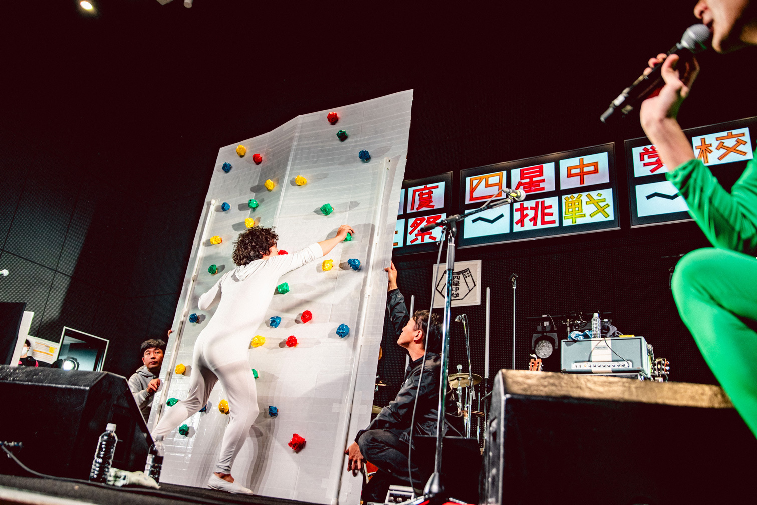 4曲目「Yeah!むっちゃ武者修行」では曲の途中で、まさやんが何故か修行をしたくなったと言い出して、UZU HALLのフロア側面にあるボルダリングスペースになぞって、段ボールで作られたボルタリングの壁を登ろうとするが登れず、壁の後ろからU太扮する登山部の顧問の先生が出現する。この文章だけを読んでいる人は意味がわからないかも知れないが、だからこそ生で体感してもらうしかない。それでいうと四星球のライブは全部が突如、途中に突然なにかが起きる。それも全てがアホらしくてバカバカしくてという最上級の褒め言葉を並べたくなる突拍子もない出来事が起きていくから目が離せないし、面白くて楽しい。