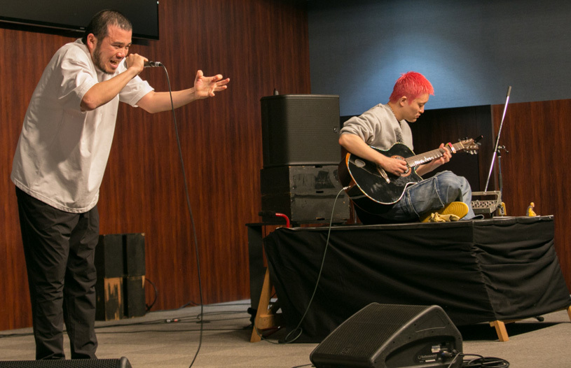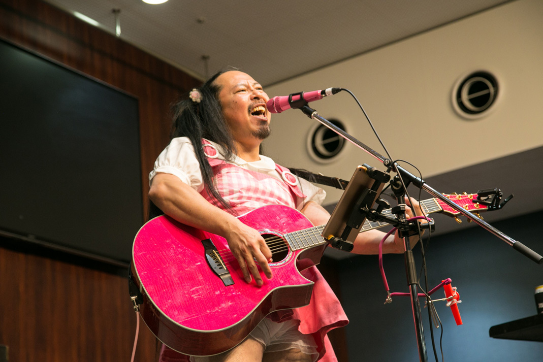 「徳島の人はわかると思うけど、こんだけ人がいるのは、こことイオンだけです!」という康雄の言葉からも改めて徳島に全国から人が集まる凄さがよくわかる。そして、康雄はドリフターズ展を観て、小道具がガラス張りの中に展示されていて触れなかったことを話した上で、「ライブハウス中心にやっているバンドは触れます!」と先程記念撮影した出演者写真パネルを観客たちに渡して自由に触らせる。まるで出演者たちが観客の上をダイブしているみたいで、その光景は壮観だった。