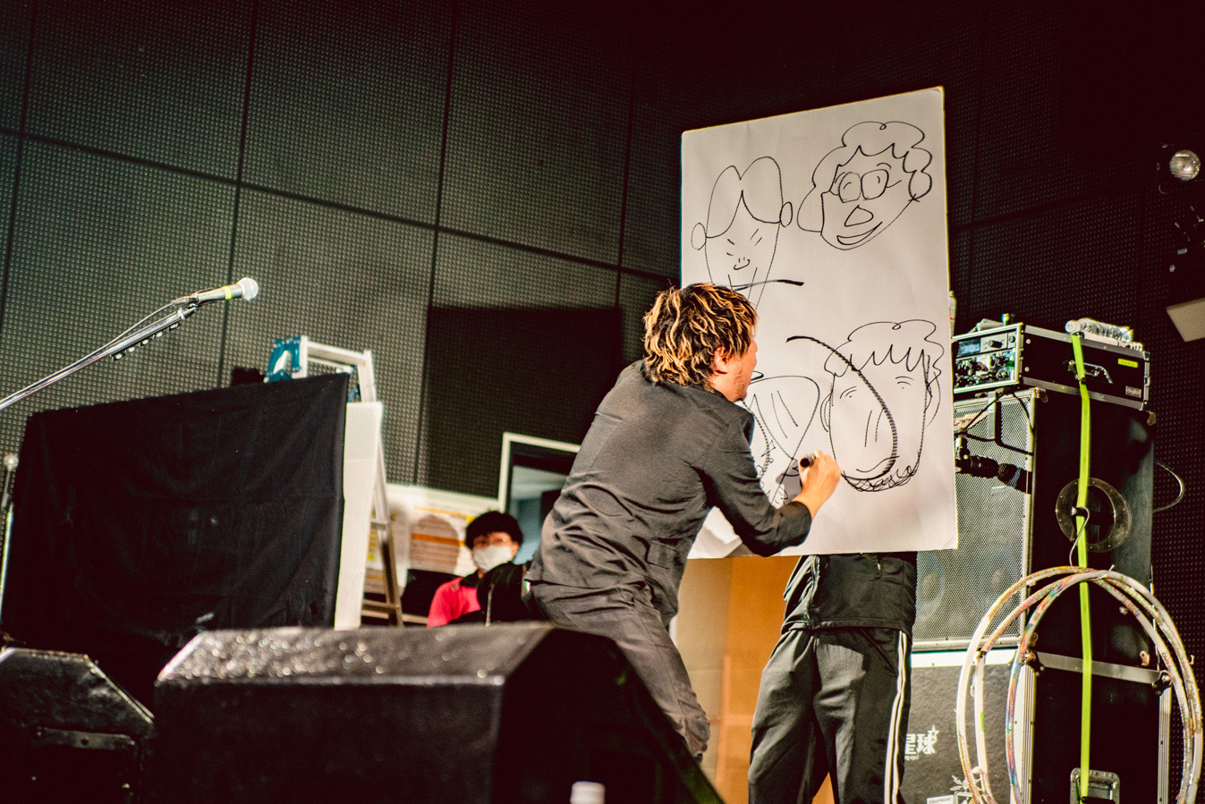 ヴィヴァルディの「春」が流れて、学生服を着た4人が登場。U太・まさやん・モリスは美術部という設定で、観客からお題をもらい絵を描いていく。京都の先輩バンドROTTENGRAFFTYのメンバーや徳島らしいものを描いたりしていくが、最後にモリスが突如狂乱してスケッチブックをビリビリに破いてしまう。康雄は「今日のワンマンはややこしいことはしません。スパッとわかりやすいです。でも長いです!」と話していたが、そうは言うものの四星球のワンマンライブは一筋縄ではいかない。ちょっとした出来事が仕掛けとなり、伏線となり、みんなが楽しめる。この序盤も後々に活きてくる。