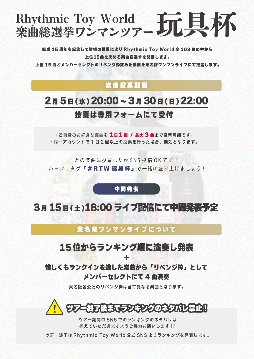 Rhythmic Toy Worldが結成15周年を記念し、ファン投票によって全103曲の中から上位15曲を決定する楽曲総選挙ワンマンツアー『玩具杯』を開催することを発表した。