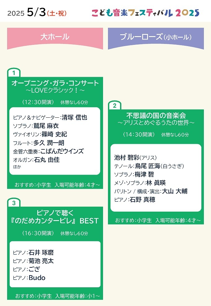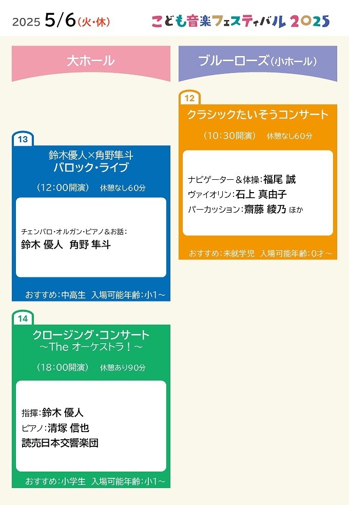 『こども音楽フェスティバル 2025』では、期間中、サントリーホールの大ホールおよびブルーローズ(小ホール)にて全14公演を開催。様々な楽器・編成で、0才の乳児から未就学児、小・中・高校生や10代の青少年まで、こどもたちそれぞれの年齢に合わせてプログラミングされたバラエティ豊かなプログラムを届ける。
