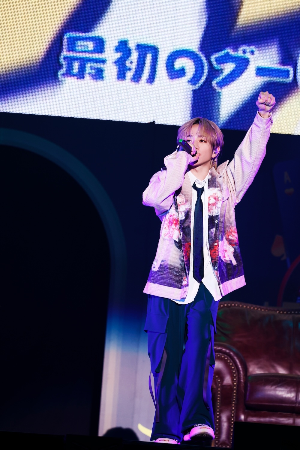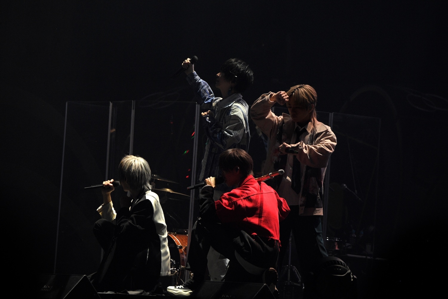 それでいて、このソロコーナーの後には再び4人が舞台上に集結。それも、オープニング時とは対照的なカジュアルなコーディネートでの登場となったため、ここからのステージングもそれにつれてラフな雰囲気へとシフトチェンジ。まずは少し長めのMCというよりは限りなく雑談に近いトークが場内を和ませることになっていった。